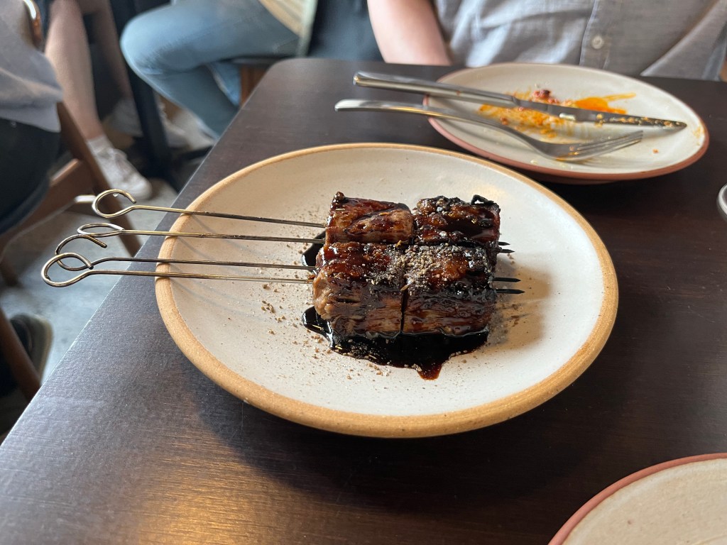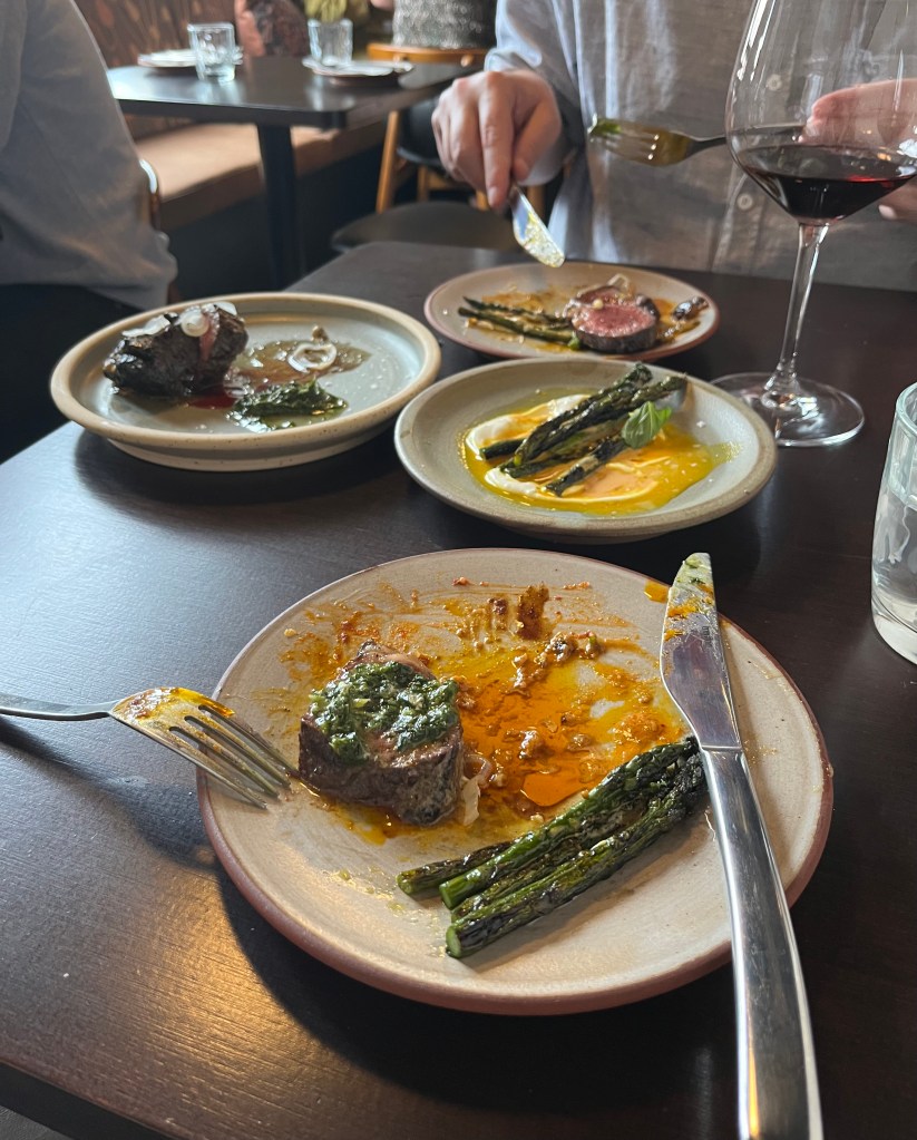 The meal continued with lamb belly skewer with black garlic that was so full of flavour, nduja and taleggio empanada with agave and pickled fennel, steamed butterfish with Morrocan eggplant and fermented tomato. The two final dishes were asparagus with red tahini, turmeric, orange and sheep labneh and wagyu beef with smoked tomato and kampot black pepper jus. To say it was deliciuos is an understatement – a truly fantastic meal and pre Christmas treat.