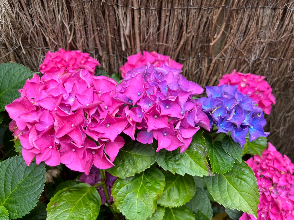 The hydrangea seems to be doing it all on its own, and making us smile.