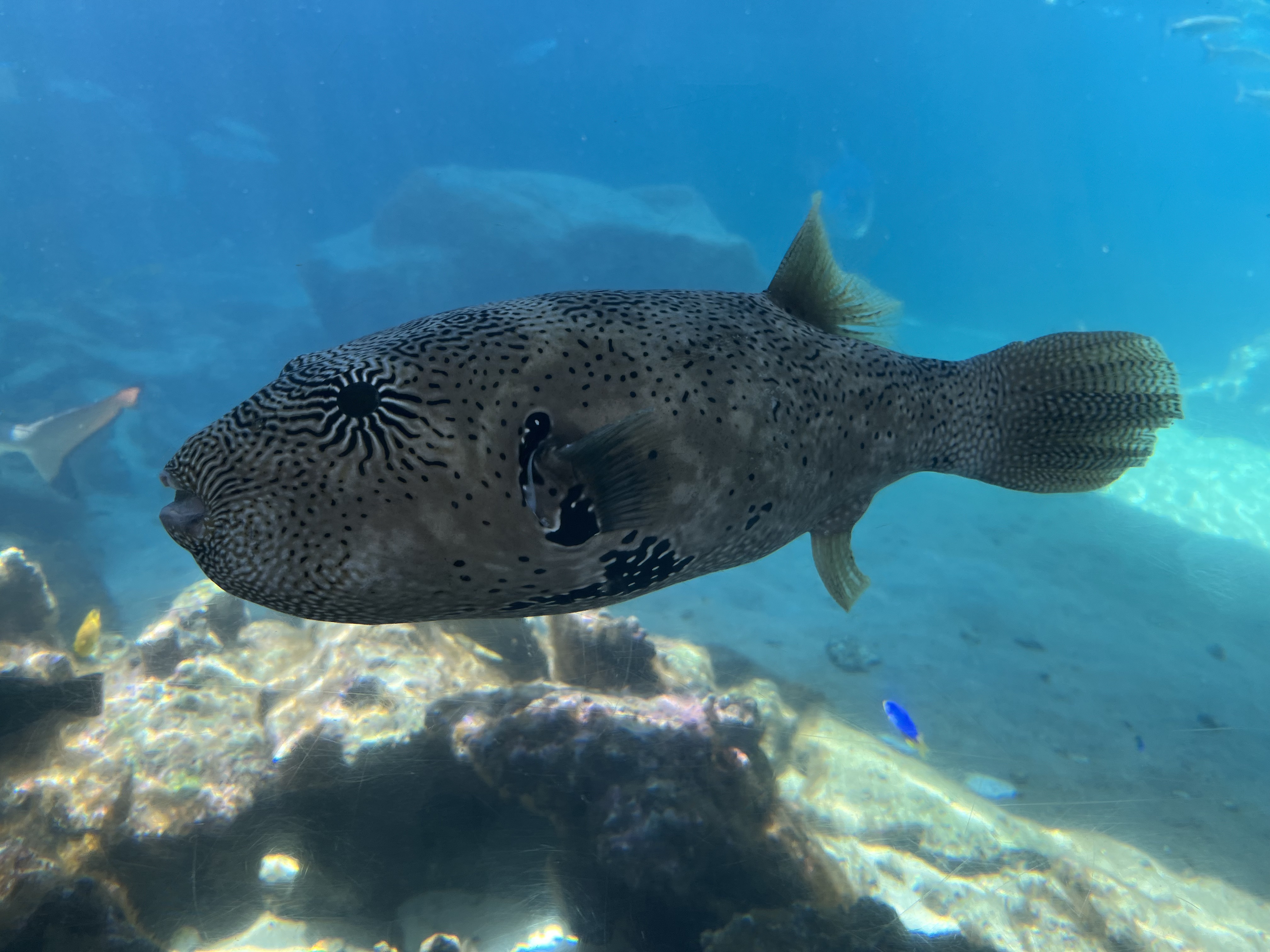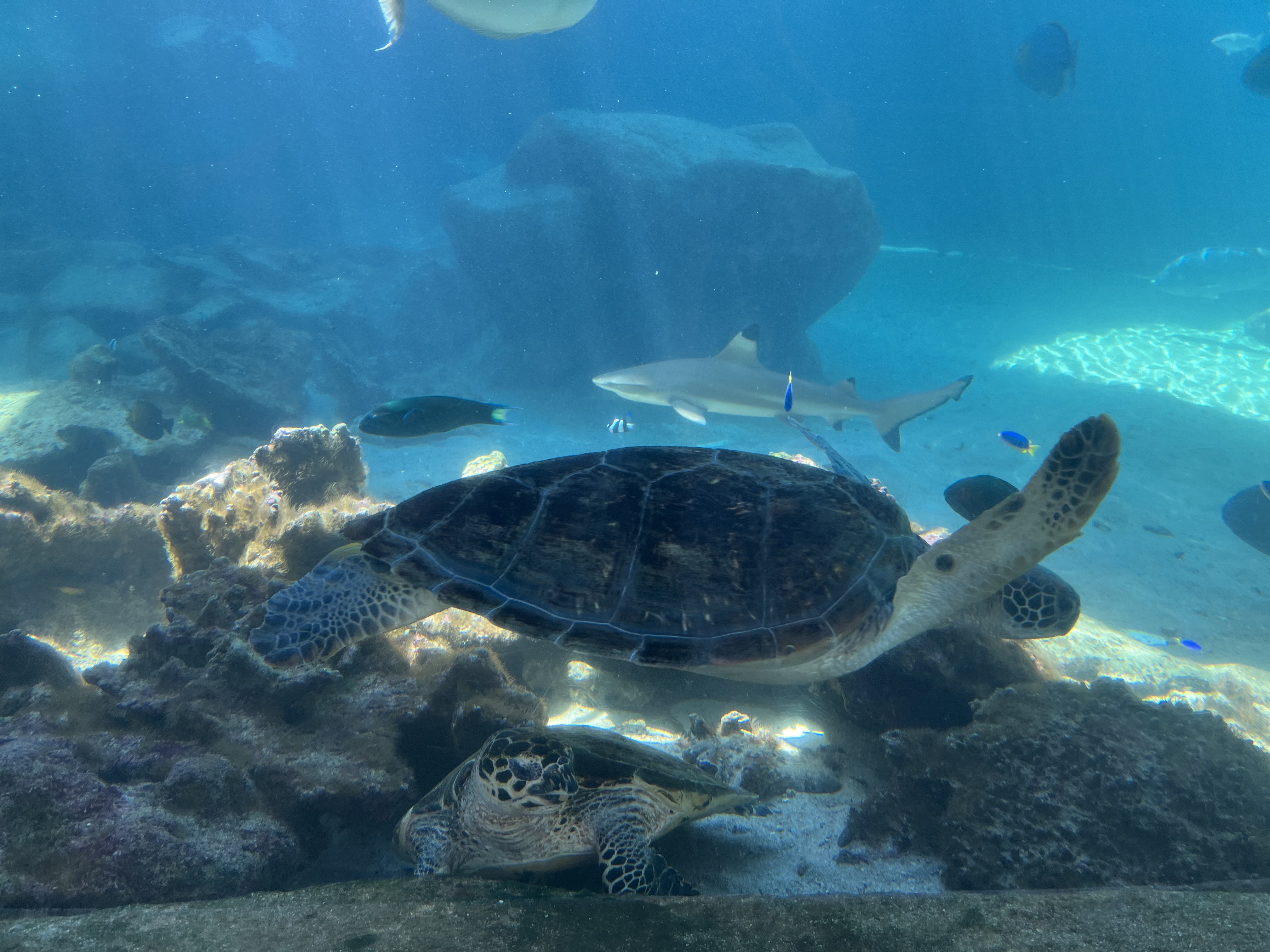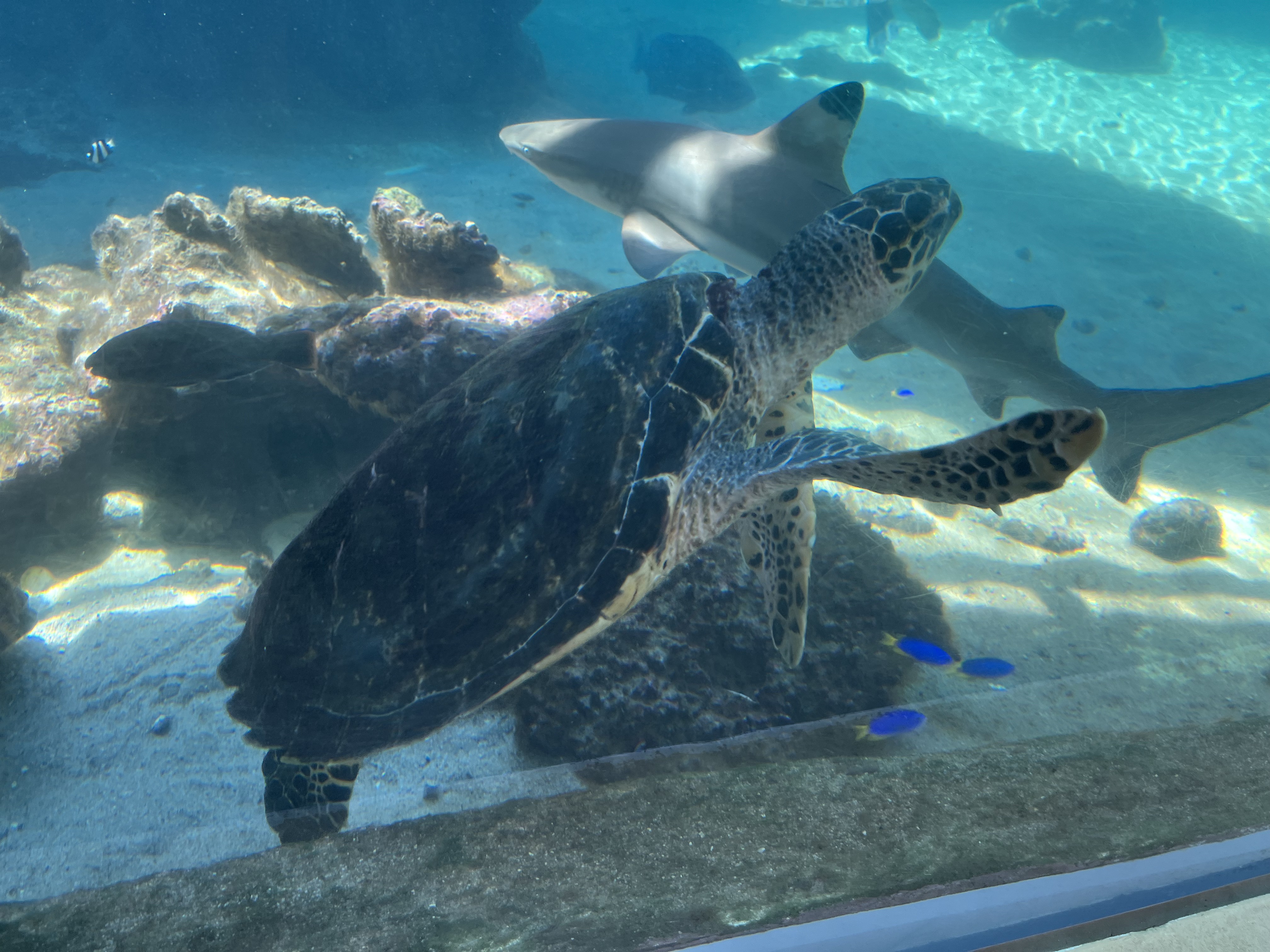 There is also a garden with an large area dedicated to turtles. This has recently been renovated and reopened, so we were glad to be able to see several of them (including a giant one that I was unable to get a good photograph of) swimming around, and coming up for air. I loved this fancy looking groper too.