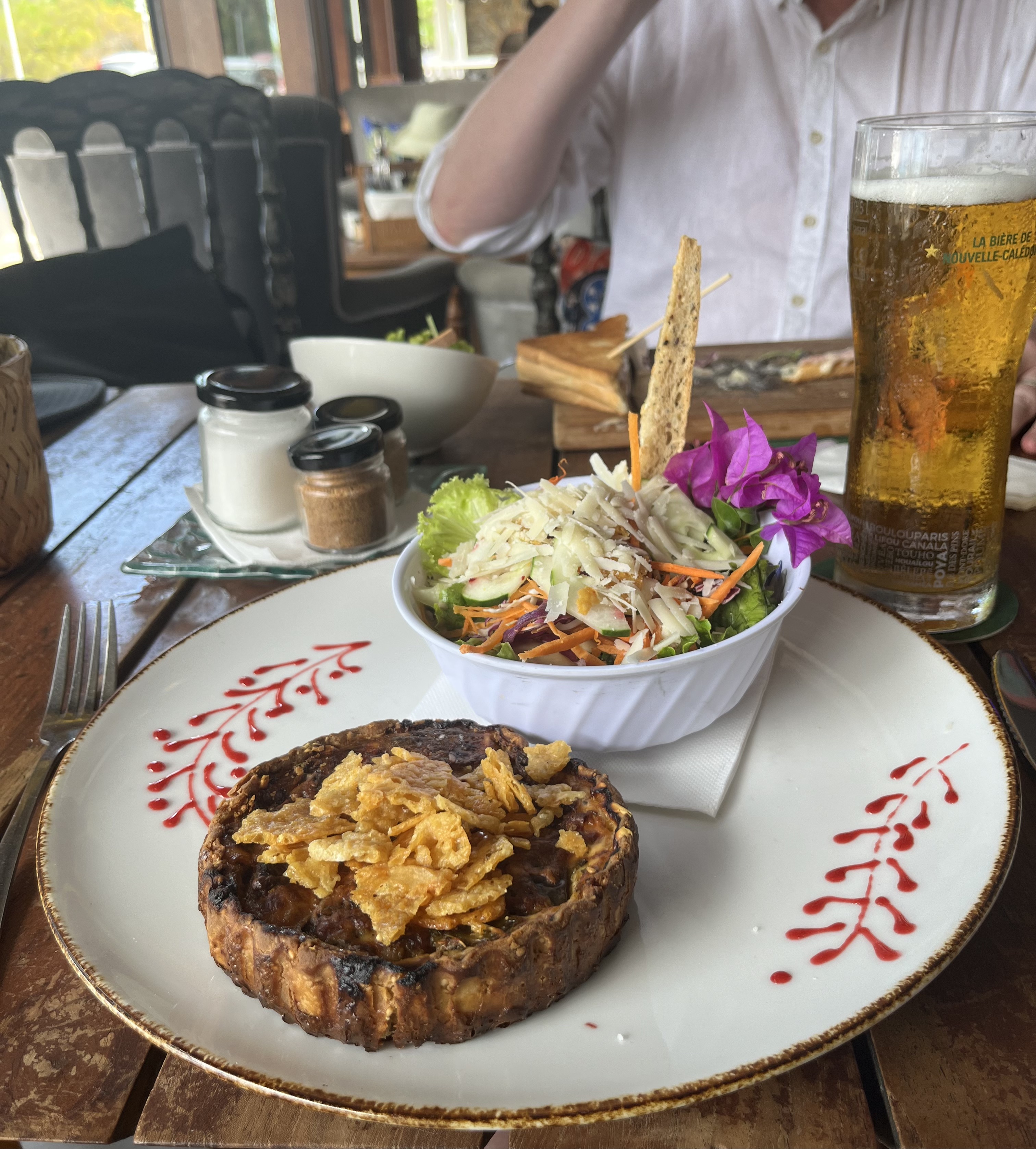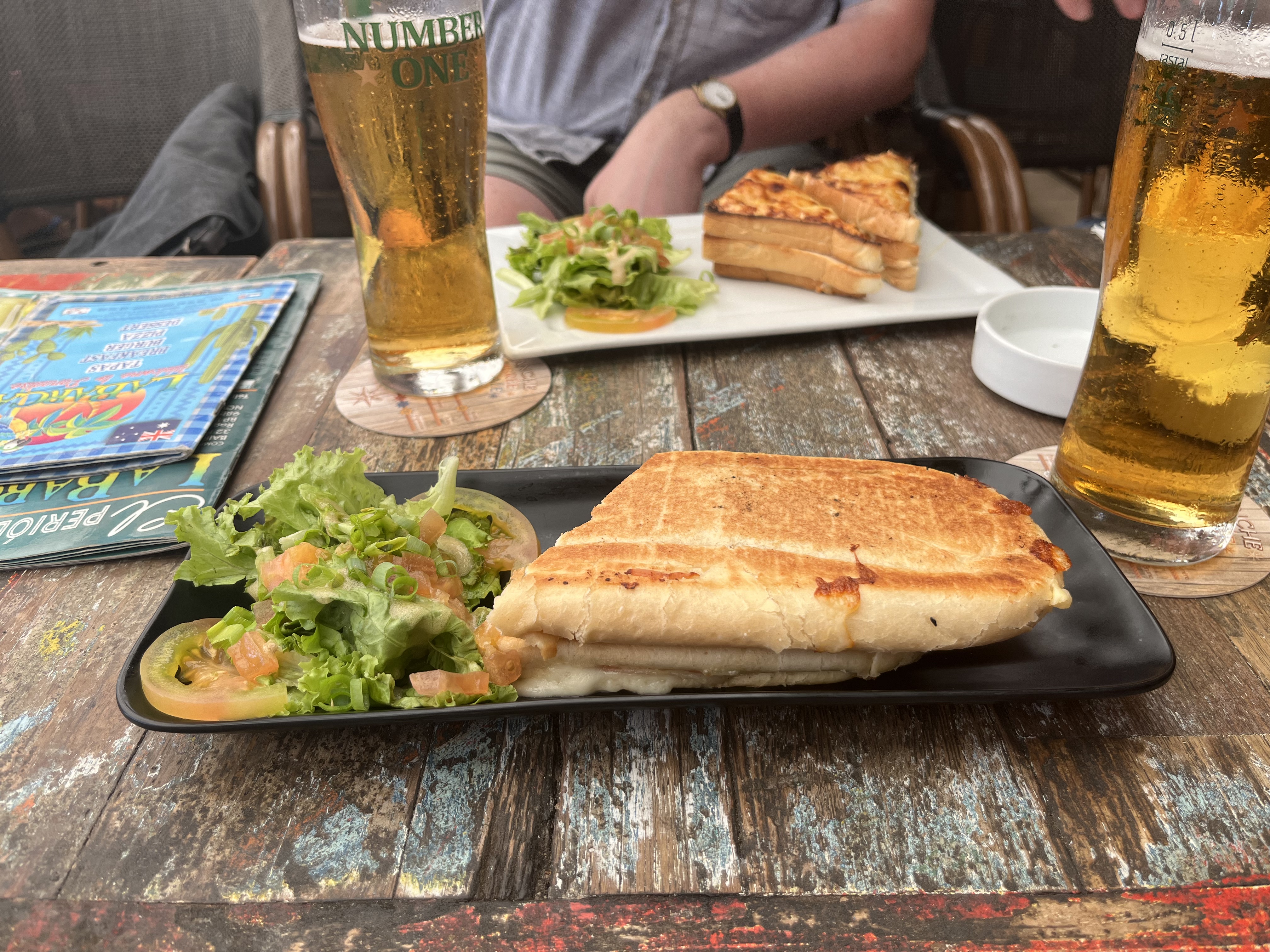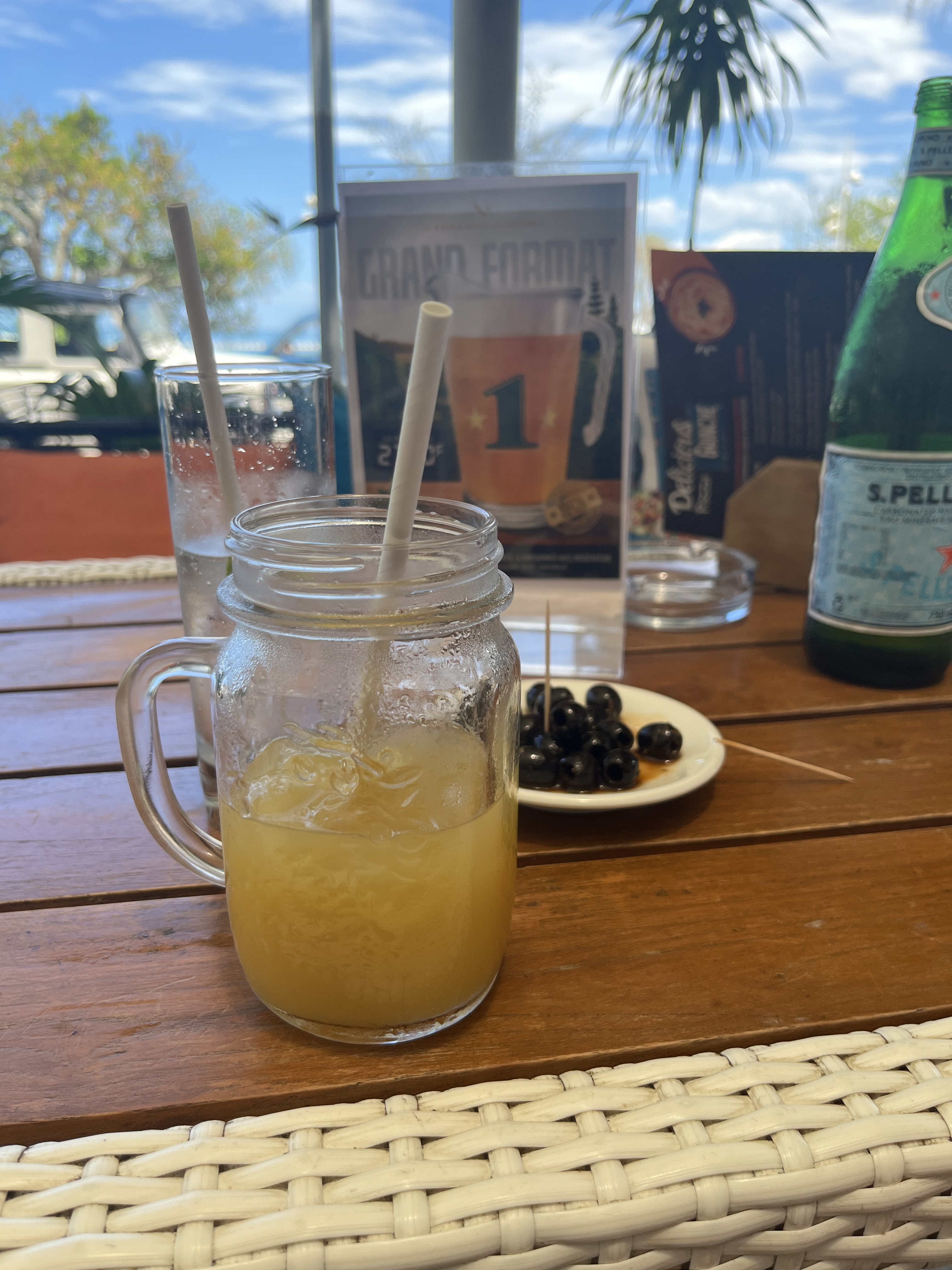 No Small Pleasures post would be complete, of course, without mention of food. Probably one of the best things I ate was the one pictured top left, some gorgeous garlicky prawns with rice and salad at a place in Baie des Citrons one evening. Actually, I ate a lot of prawns and seafood when we were away, not being able to resist. Anyway, after our visit to the aquarium, we were in needed of refreshment, and this pineapple juice was so perfect on a hot day. A few lovely salty olives went well with it. Karl had another croque monsieur that day for lunch, and I had a rather good panini with salad. Yes we did enjoy more ice cold beer – well, we were on holiday! I had a very good duck breast salad, served with a potato, egg and lots of greens one day for lunch and a very cheesy vegetable quiche, again with a good salad, for Saturday lunch.
