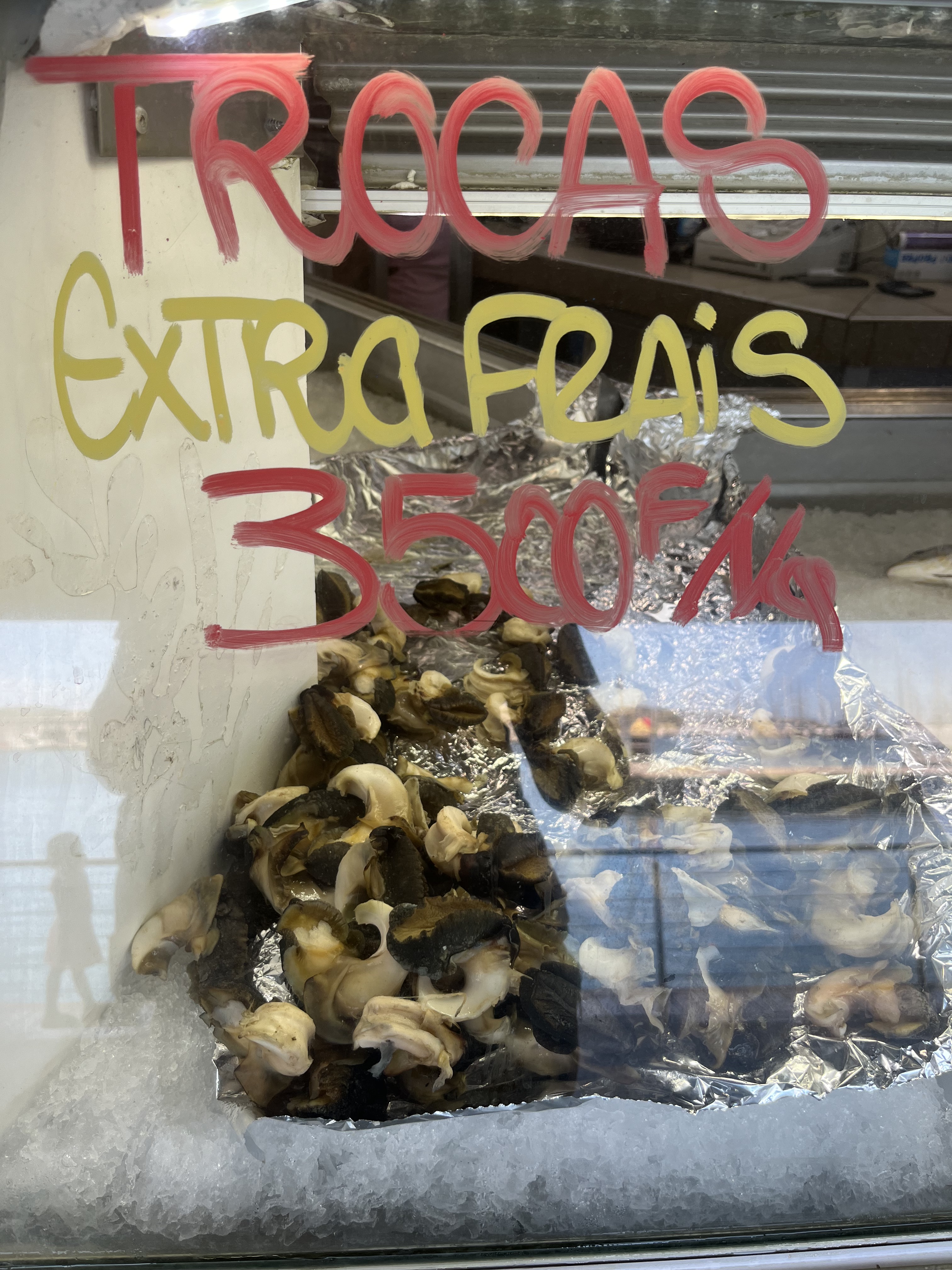 On Saturday morning, we popped back to the market, which was buzzing with activity. I found a couple of t-shirts for 2 of my great nephews, before we headed off for lunch. Trocas, I believe, is a variety of sea snail.
