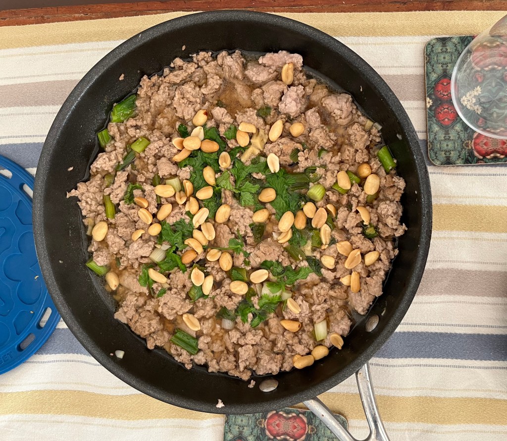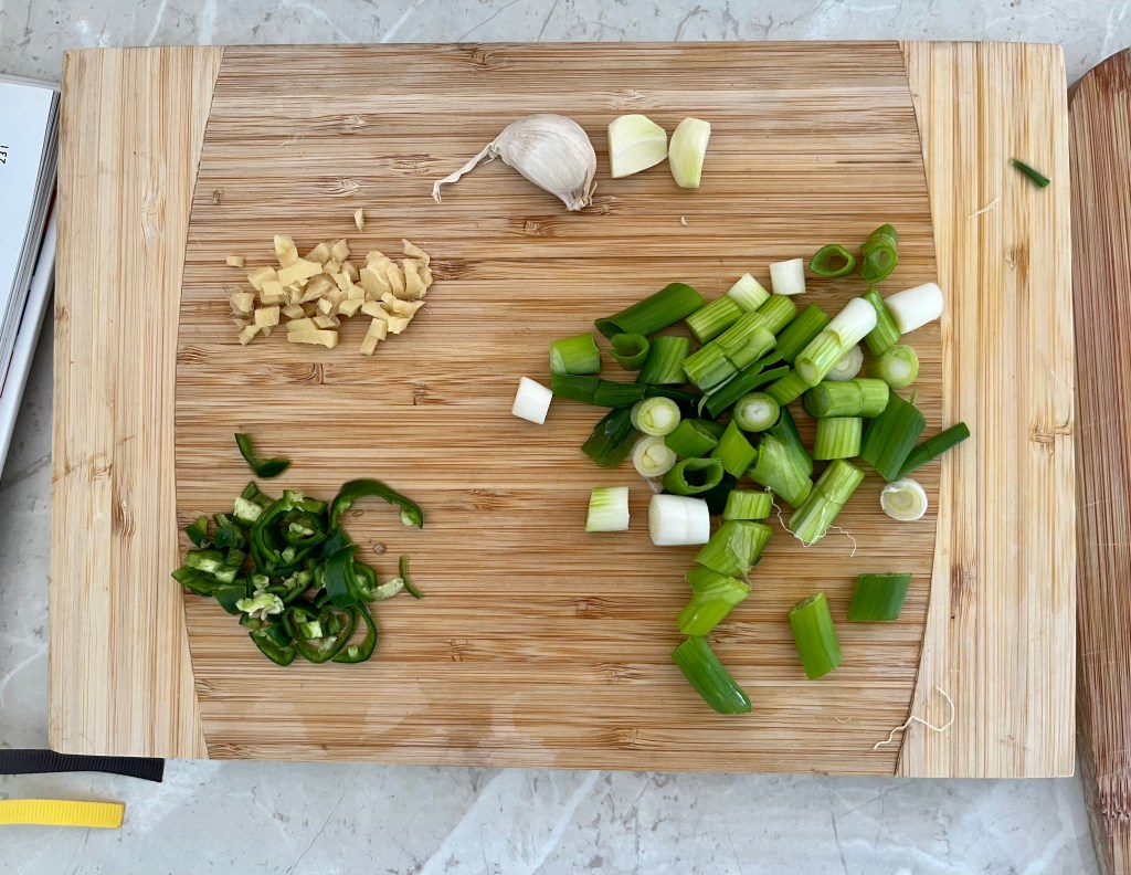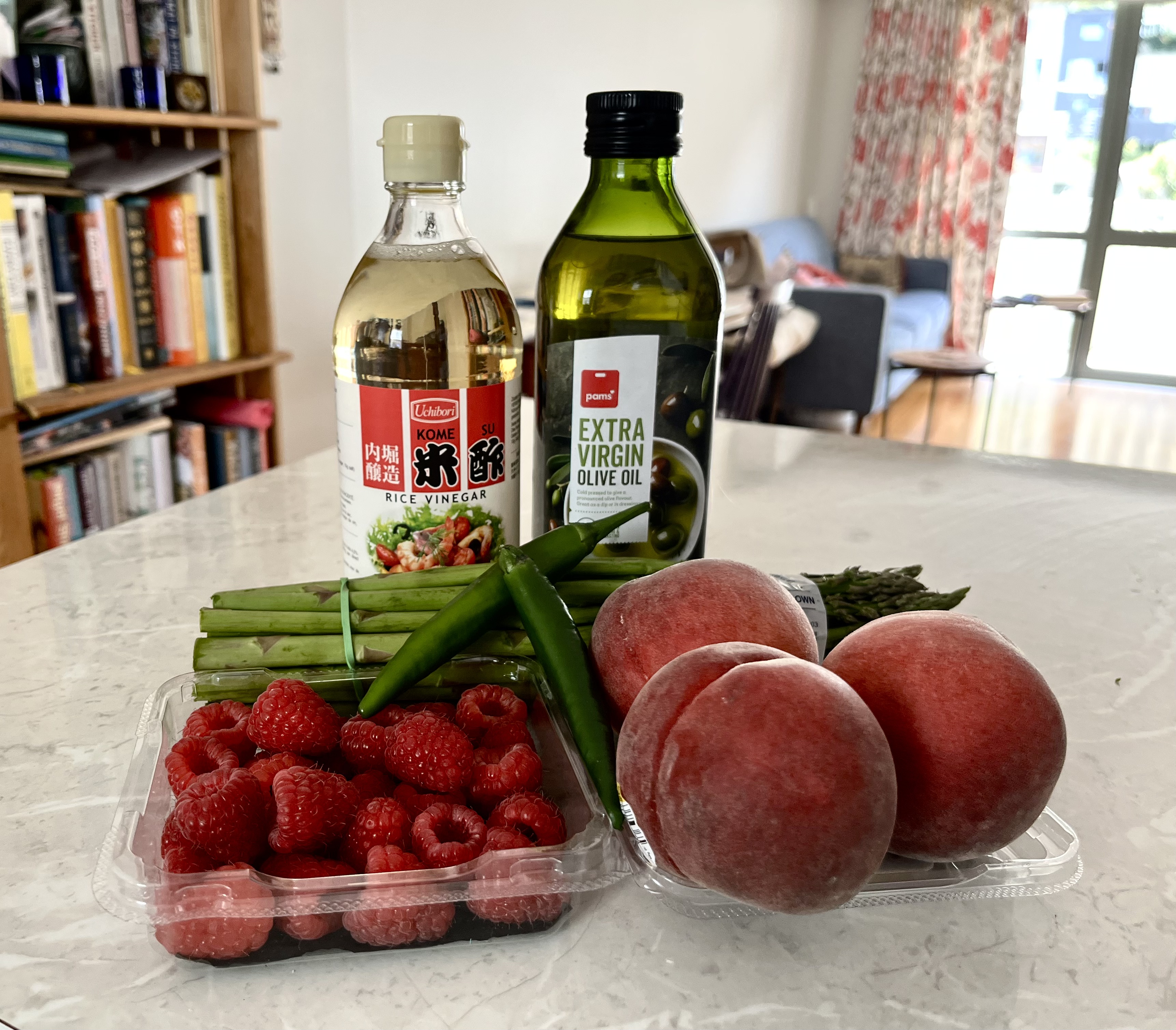 It was then time to call in at the supermarket, for a few things like olive oil, rice vinegar, green chillis, peaches, raspberries and asparagus. For dinner I made pork with ginger, spring onion and aubergine from Ottolenghi’s Simple, a favourite in this house.