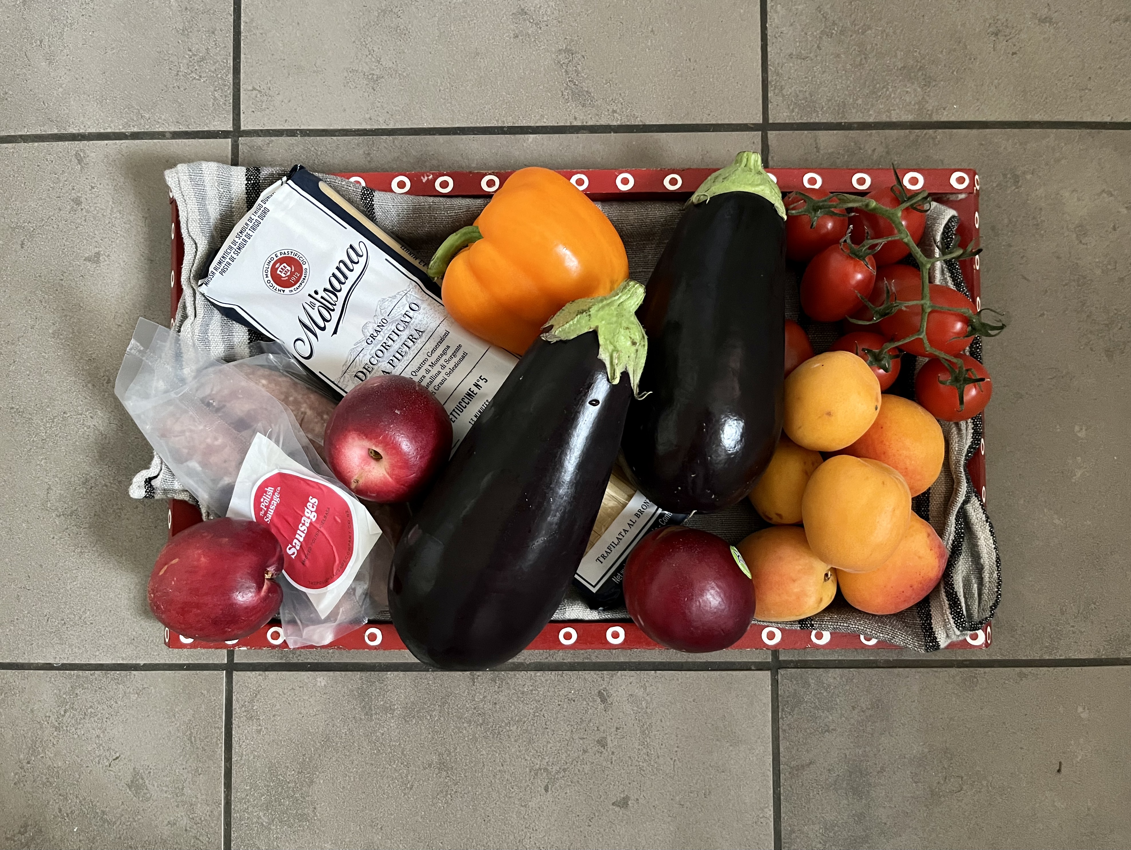 Anyway, I topped up the box with a bunch of watercress, some edible flowers/microgreens, aubergines for a moussaka, a capsicum and tomatoes, apricots and nectarines. There was also some pasta, Polish sausage (from local The Polish Sausage Company), and of course burrata and mozzarella for that touch of summer.