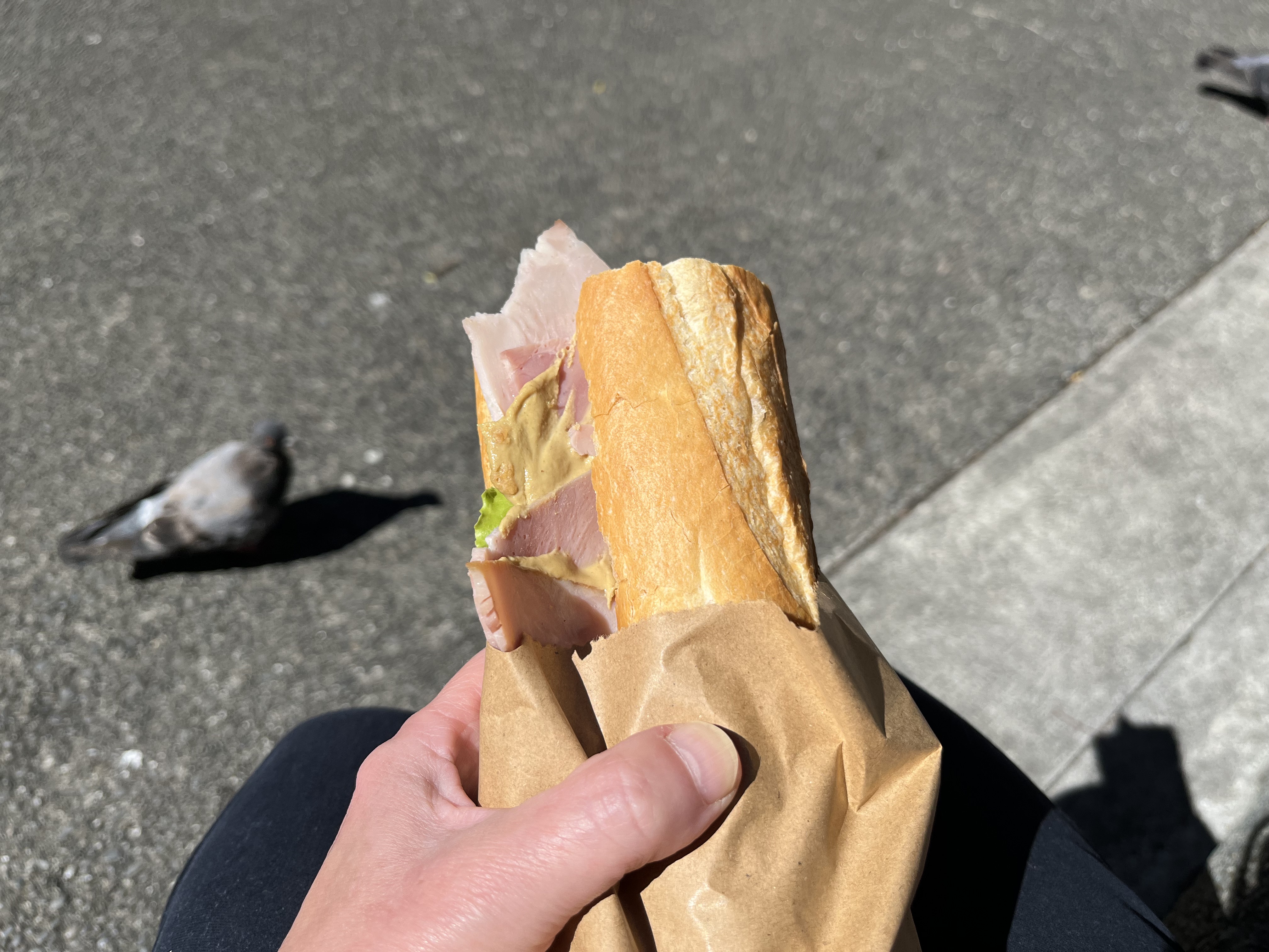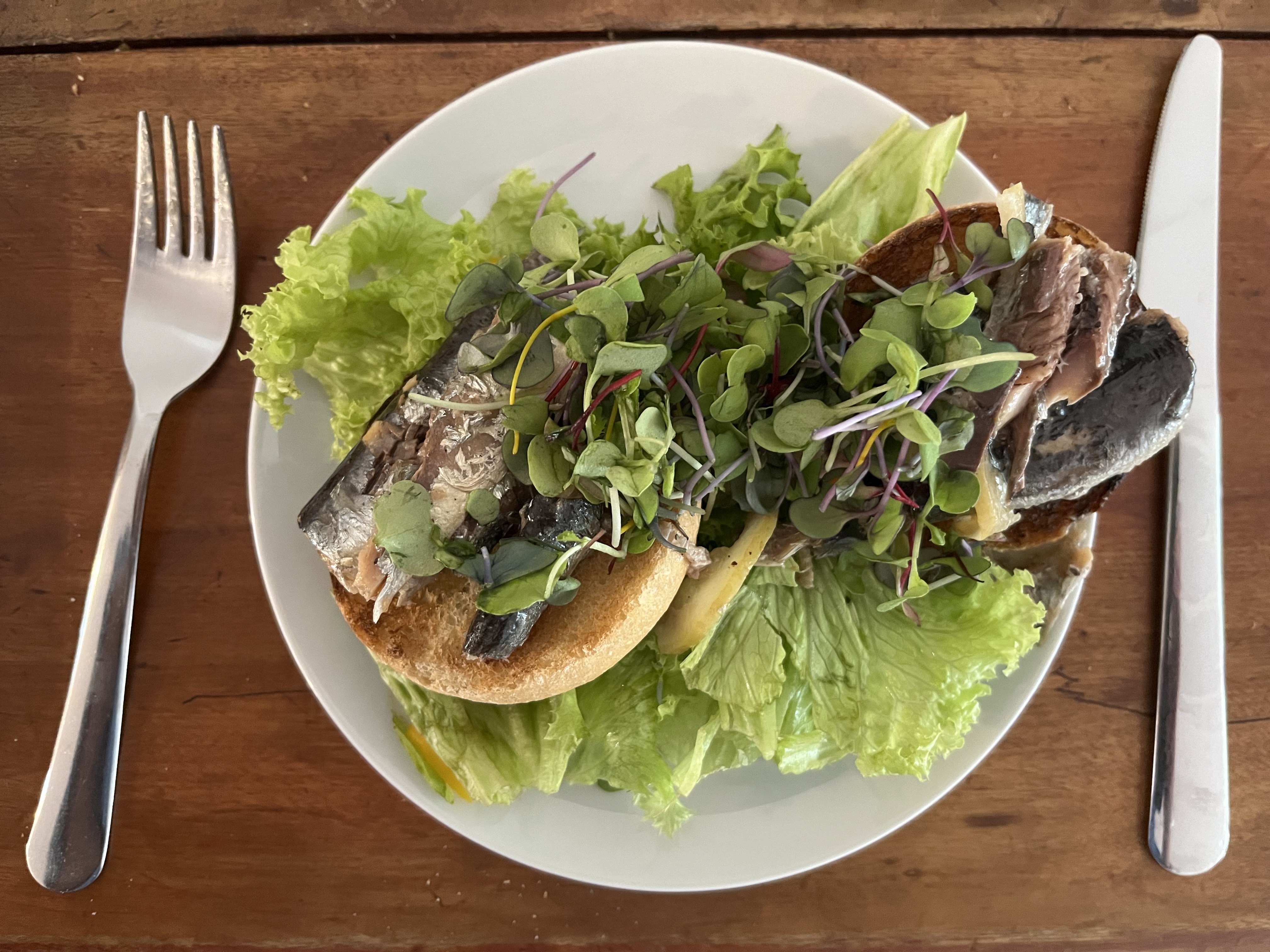 On Tuesday I just felt like a crunchy baguette, and this one filled with lettuce, ham and mustard from The French Baker‘s Wellington shop hit the spot. The pigeons in Midland Park seemed to think it looked good too. I met a friend for lunch on Wwednesday, and we both enjoyed the mushrooms on toast, topped with tomato and cheese at Urban. My Sunday lunch was a semmel roll from Arobake filled with salad and ham, with a couple of tomatoes and a few crisps on the side (and yes some of them are purple), and today was the joy of sardines on toast.