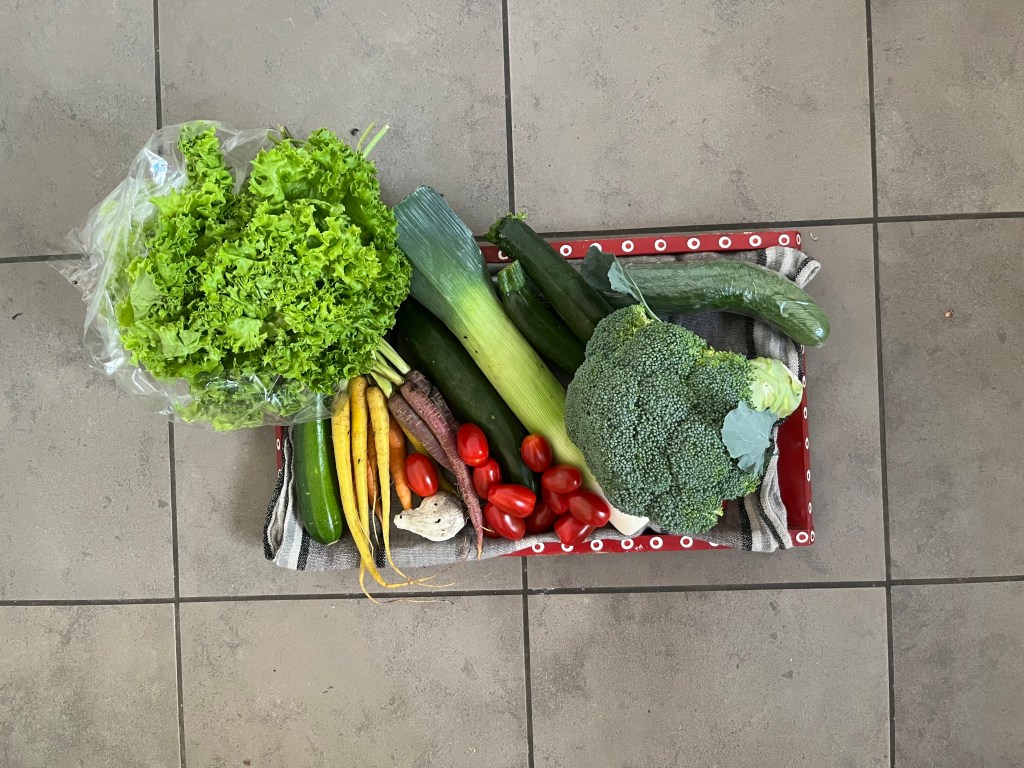 There was an excellent selection in this week’s Wonky Box – a lettuce, courgettes (zucchini), a cucumber, tomatoes, a bunch of baby carrots, garlic, a leek and a large head of broccoli. I supplemented it with a couple more grapefruit, pears, full sized carrots, capsicum, new season kumara and (not shown) a punnet of raspberries for Sunday’s dessert.