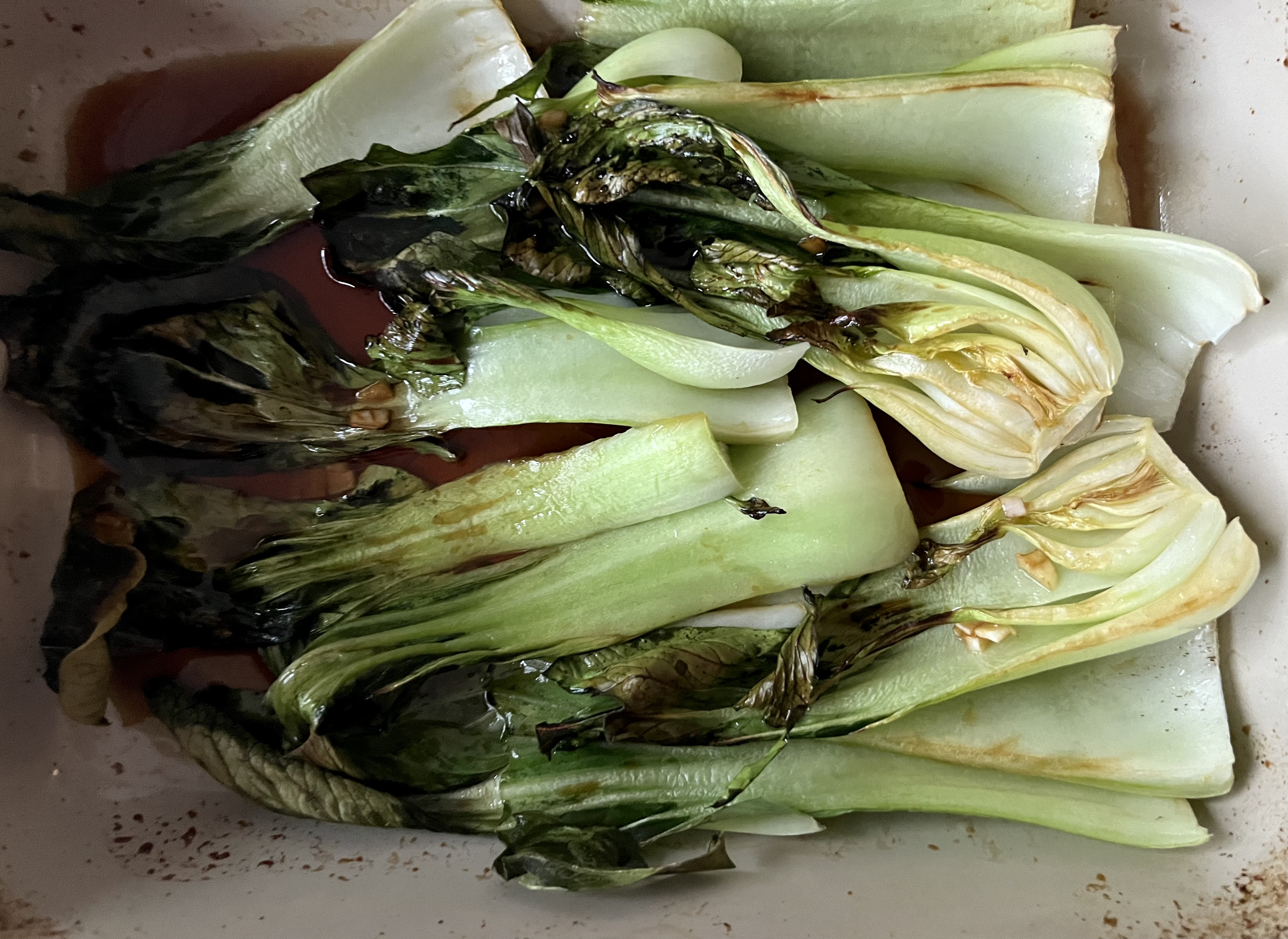 There was also bok choy this week, and rather than just put it into a stir fry, I decided to roast it, covering it with a mixture of soy sauce, sesame oil, maple syrup, garlic, a squeeze of lemon juice and a dash of olive oil. This was absolutely delicious, adding flavour to a potentially otherwise pretty tasteless vegetable. They were in the oven for about 20 minutes at 180C, but do check from time to time according to your own oven (and whether it is fan forced or not too).