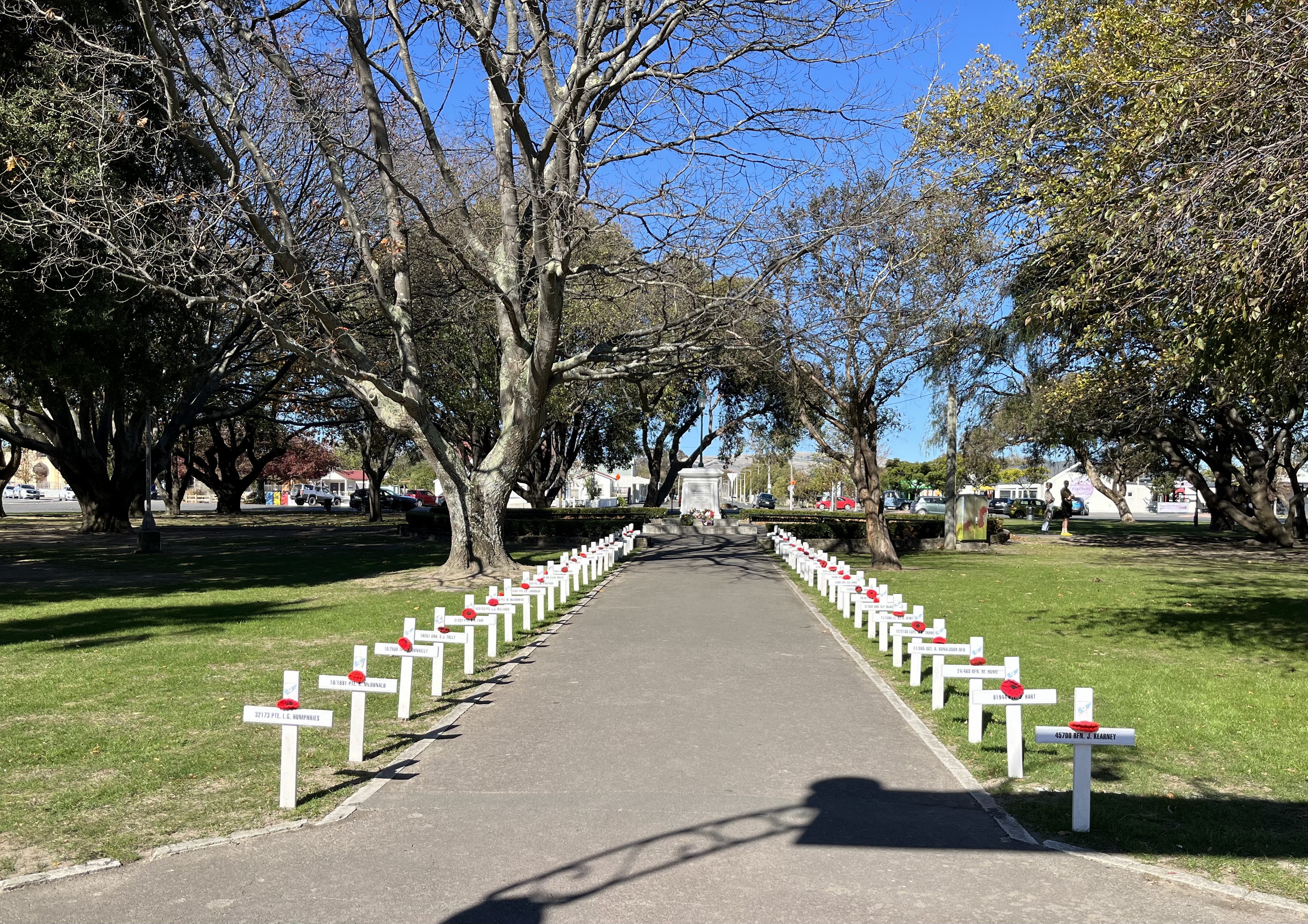 Sunday turned out to be a gorgeous sunny day, so we got out of the city and drove over the hills, stopping first in Greytown for lunch at Main Street Deli (where I had the Swedish shrimp open sandwich, served on proper rye bread) before driving to Martinborough for some wine shopping, browsing and looking at the Anzac crosses and poppies.
