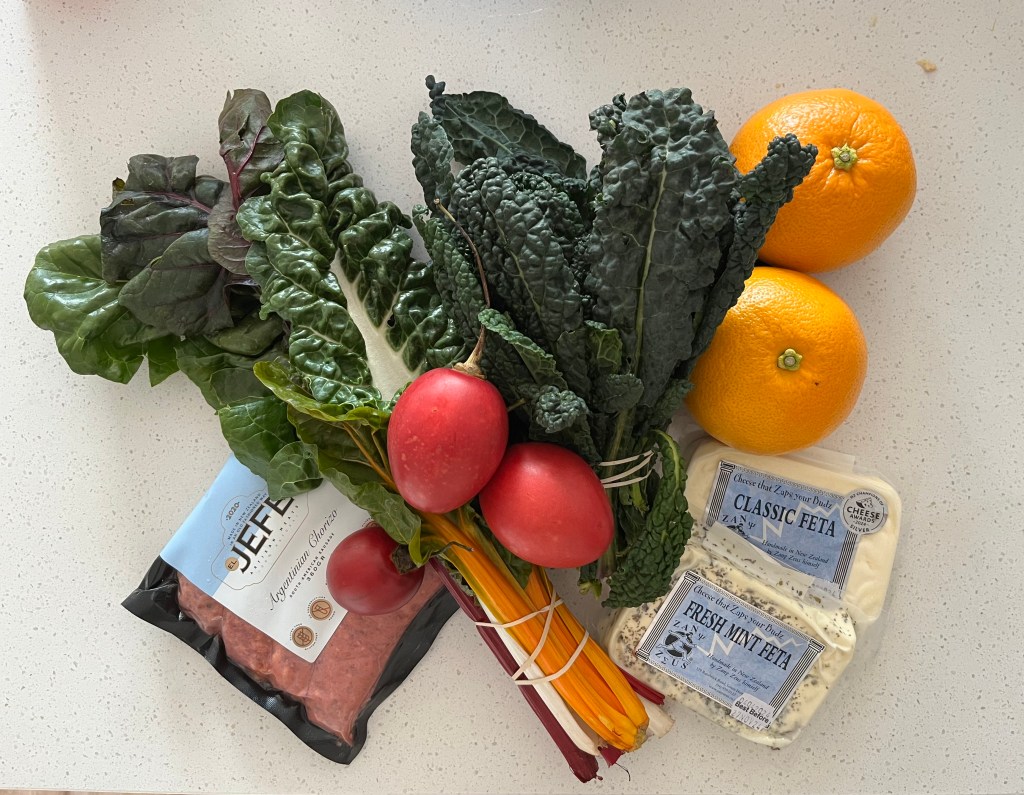 The Wonky Box was certainly colourful with (another) spaghetti squash, a leek, avocados, yams (oca), parsnips, potatoes, mushrooms, a large head of broccoli and a curly lettuce. I added some greens (the cavolo nero served with the sausages, and lots of roasted root vegetables left over from last week) and rainbow chard (for Wednesday’s soup), two more of these excellent grapefruit, some feta and tamarillos. I made lamb and feta burgers during the week which we had with homemade kumara chips (or fries) and veggies which was an excellent meal, and I put together a lasagna which I heated up when we got home from the cinema with leftovers for today.