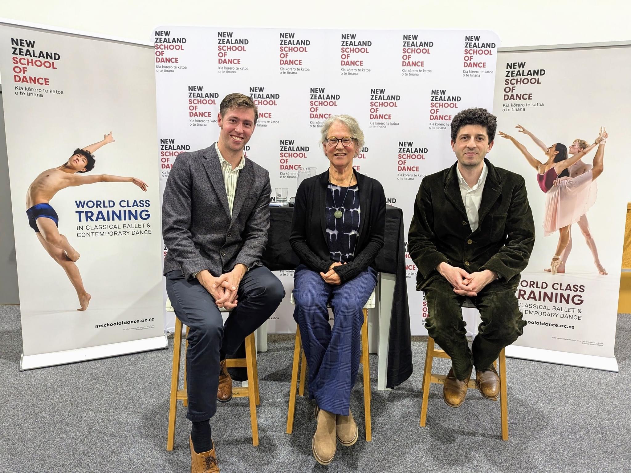 On Thursday evening, a friend and I headed over to the New Zealand School of Dance for another one of their Pointes of View evenings of conversation. Ty King-Wall, the newly appointed Artistic director of the Royal New Zealand Ballet and Tobias Perkins, the executive director were interviewed by broadcaster Eva Radich. It was an interesting conversation, but despite probing, we did fail to learn what will be performed next year. The photo below comes from the school’s Facebook page.