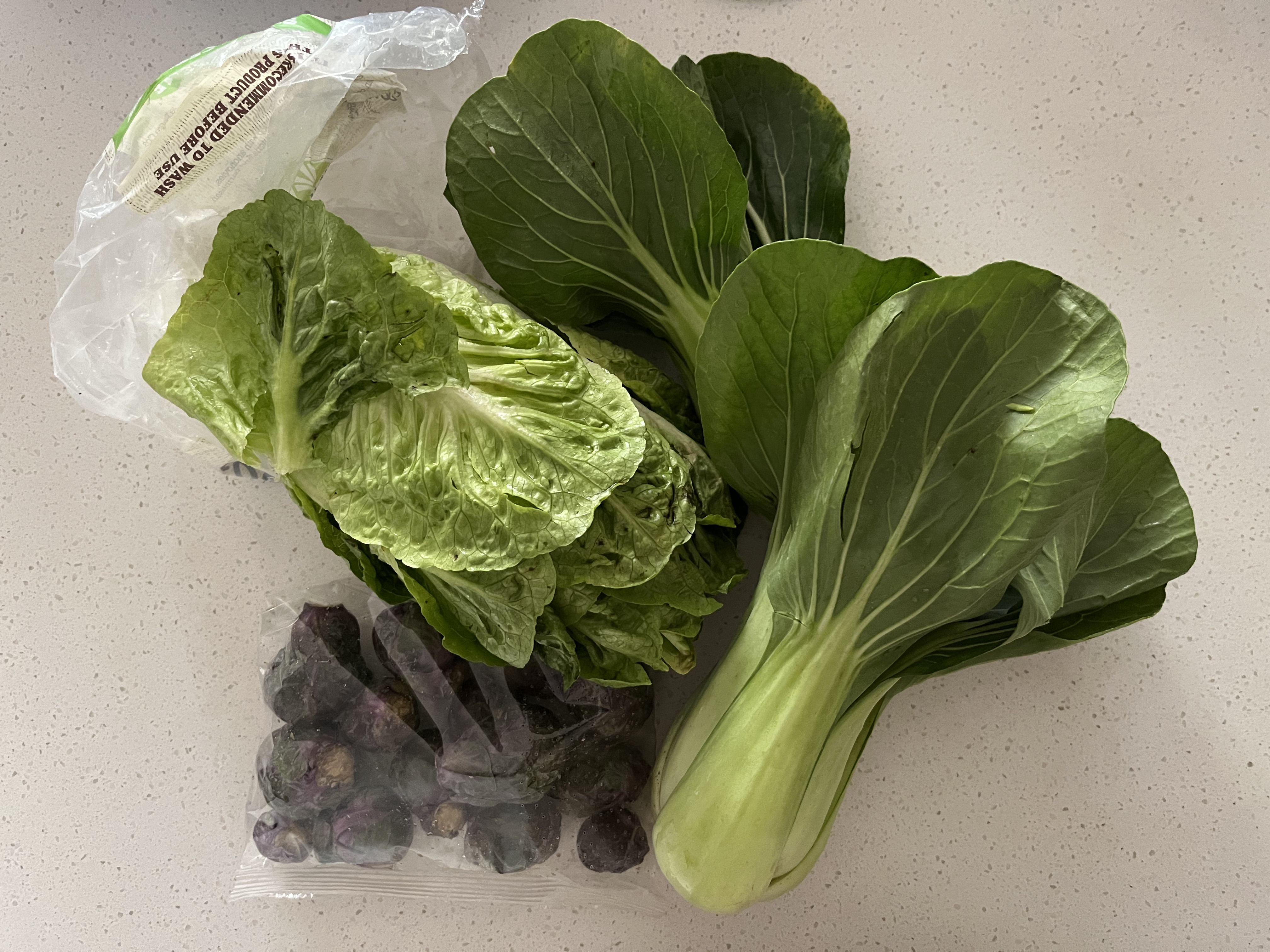 The wonky box delivered up a butternut squash, carrots, a leek, a celeriac, more avocados, potatoes, a lettuce, a bag of purple Brussels sprouts (which we ate on Saturday) and two bok choy. I still had pumpkin leftover from last week, but remembered the pork and pumpkin meatballs I made back in March last year, so we had those for Sunday dinner with the rainbow chard. I topped the box up with spinach, some beautiful rainbow chard, apples, red onions, a couple of madarins and some red and yellow tamarillos. I popped to the local market on Saturday and picked up a lovely little loaf of rye bread, some eggs, a tray of microgreens (I really need to get organised and grow my own), a packet of locally made chilli garlic kosher salt and a bulb of smoked garlic. I squeezed a couple of cloves over the sprouts which worked well.
