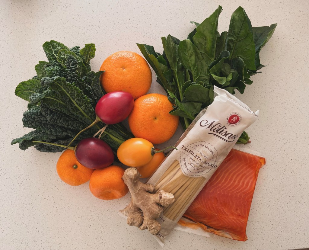 I topped it up with cavolo nero and spinach for more greens, a couple of grapefruit, tamarillos which I am really enjoying at the moment, a piece of ginger, pasta and smoked salmon, cured by the butcher, part of which went into a fish pie (forthcoming post on Wednesday).