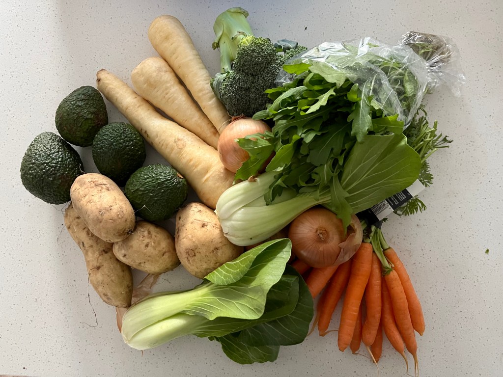 The Wonky Box delivered yet more avocados (I do like them…but you can have too many), white kumara, parsnips, a bunch of carrots, broccoli, more bok choy (such a boring vegetable), onions and a lovely little bunch of rocket that formed the base of Friday evening’s salad (eaten with an excellent steak from our local butcher).