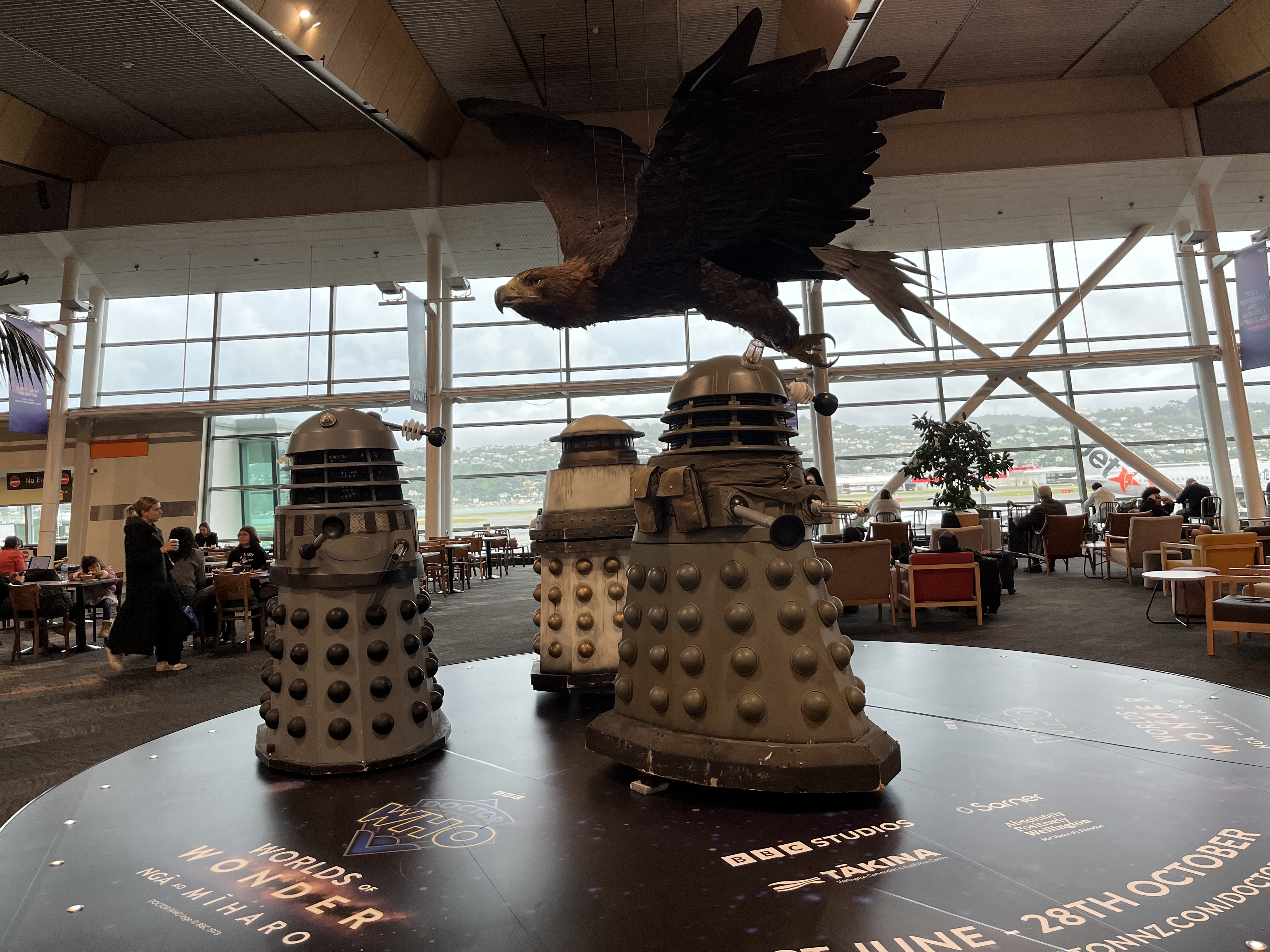Daleks at the airport! Where is the Dr? No need for concern…they are advertising the current Dr Who exhibition in town. The bird? A reminder that many years ago The Lord of the Rings was filmed here.
