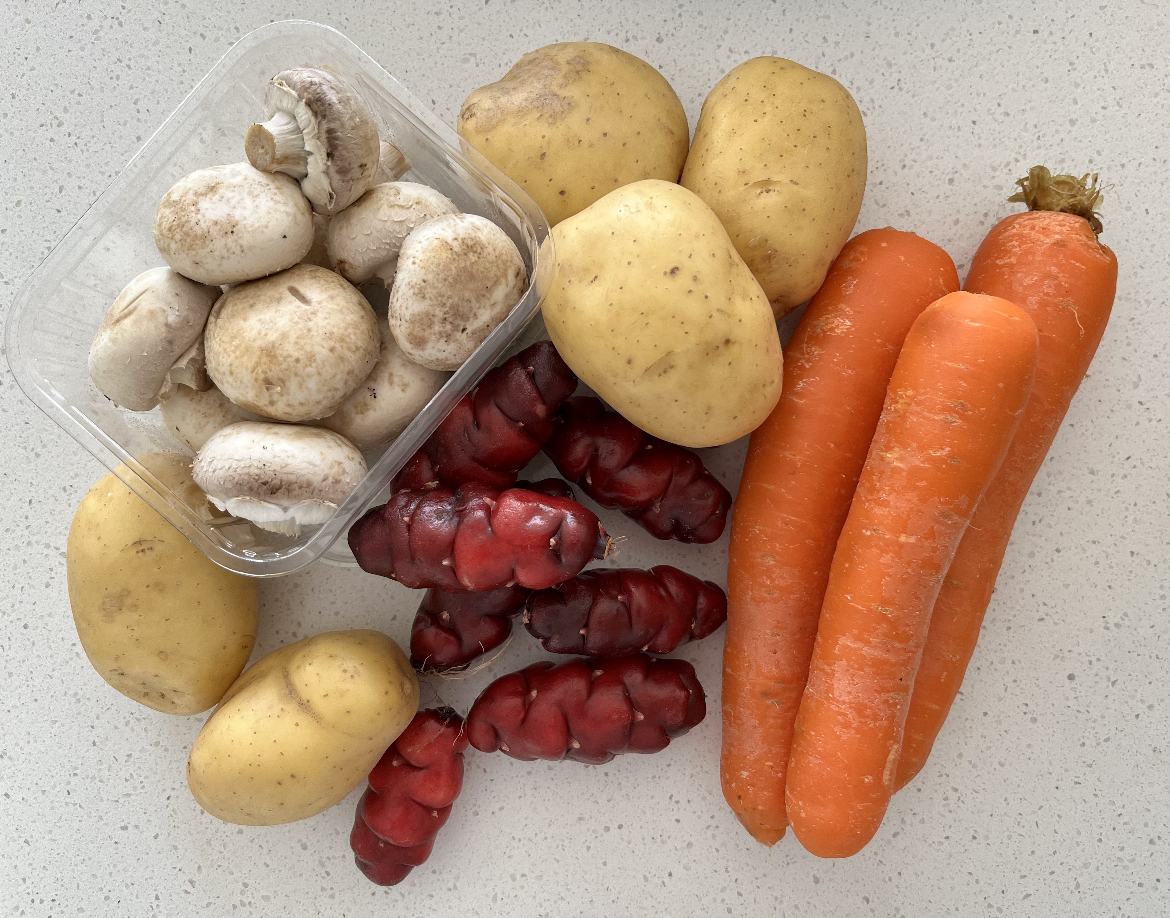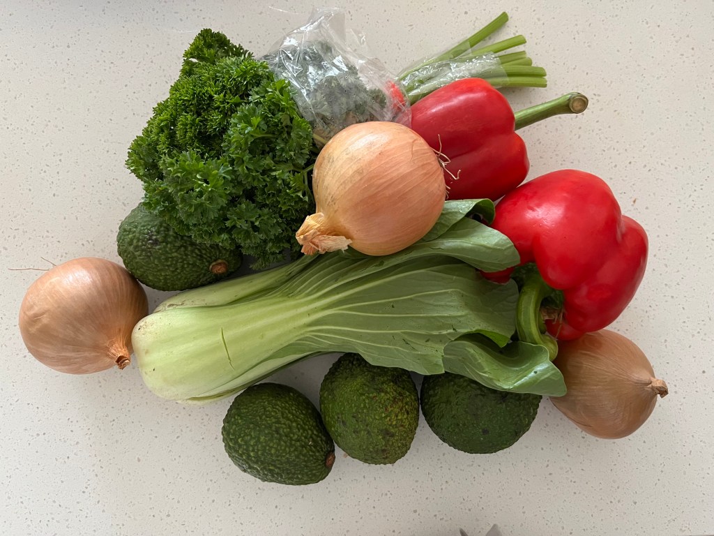There were some good things in the Wonky Box this week….and yet more avocados. I really must take some to work on Monday! Anyway, there were also carrots, potatoes, yams (ocas – the dark red objects on the left, mushrooms, a lovely big bunch of parsley, two great looking capsicum, onions and the no longer dreaded pak choy now I have found a good way to cook it.