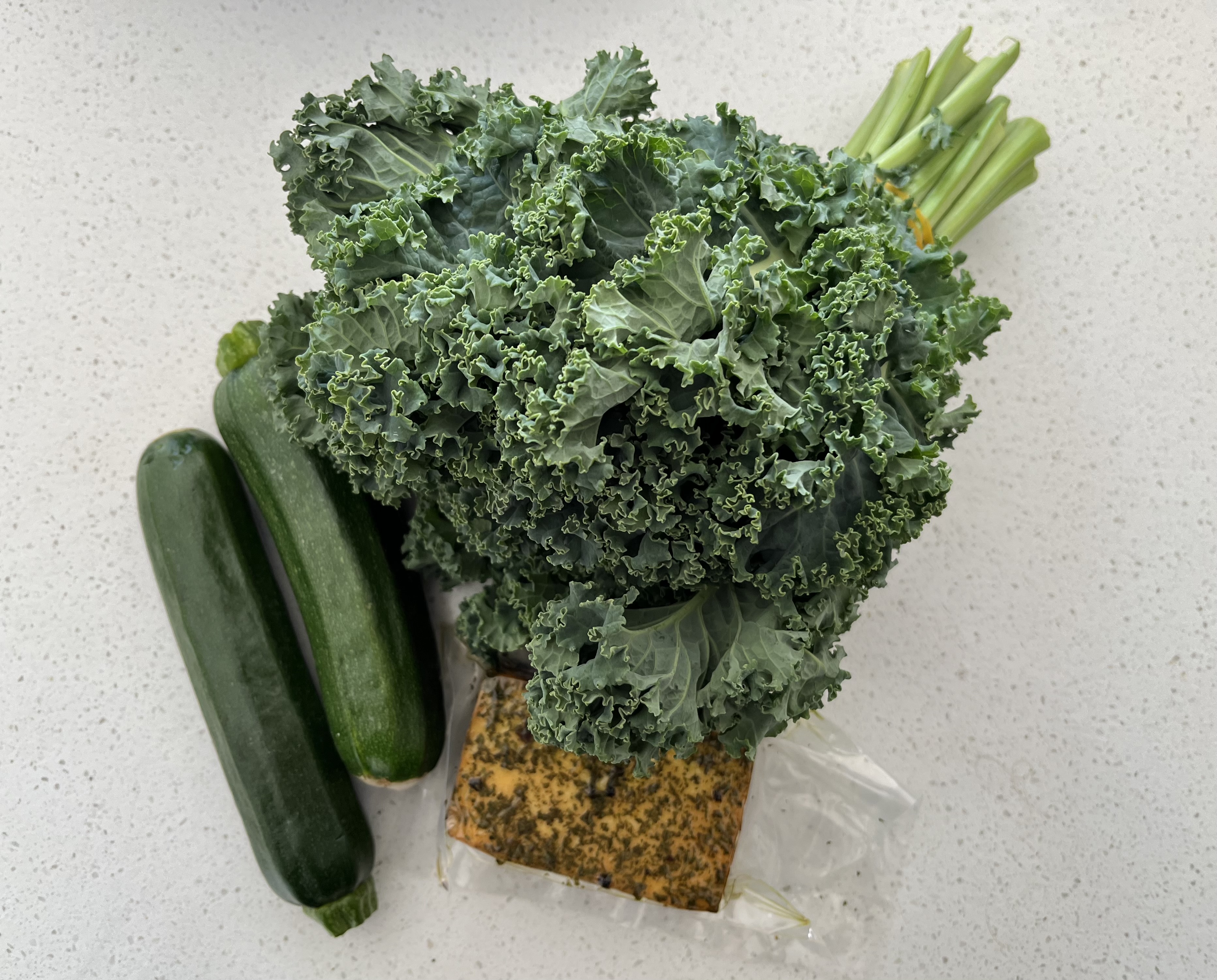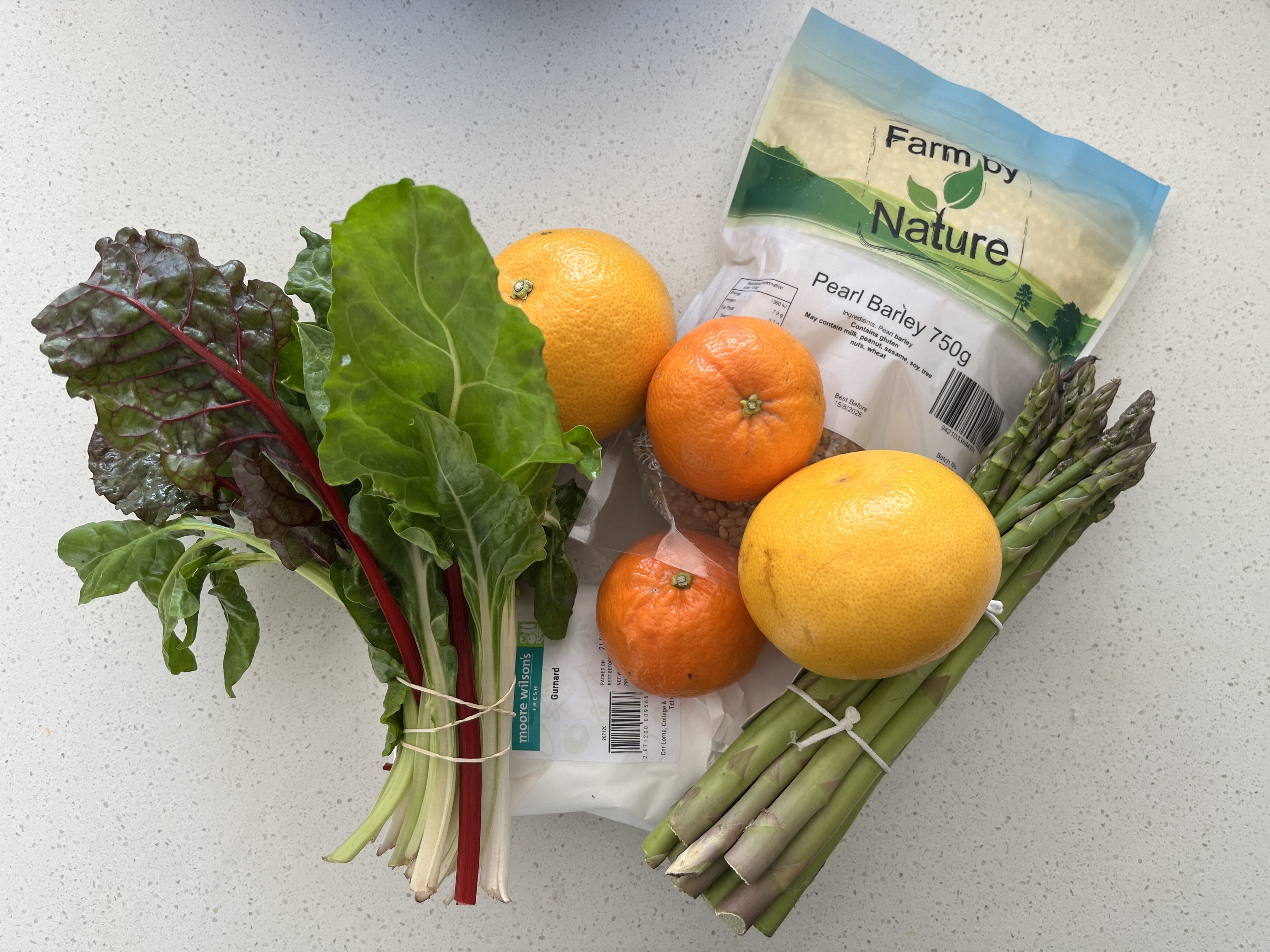 I picked up some rainbow chard, seasonal asparagus, grapefruit and a couple of tangelos, along with a bag of pearl barley to cook with lamb from our local butcher, and some gurnard for Saturday dinner. From the little market that runs on Saturdays close to home, I got this lovely bunch of kale, a couple of courgettes, and this excellent locally made smoked cheese with a coating of a herb/garlic mixture.
