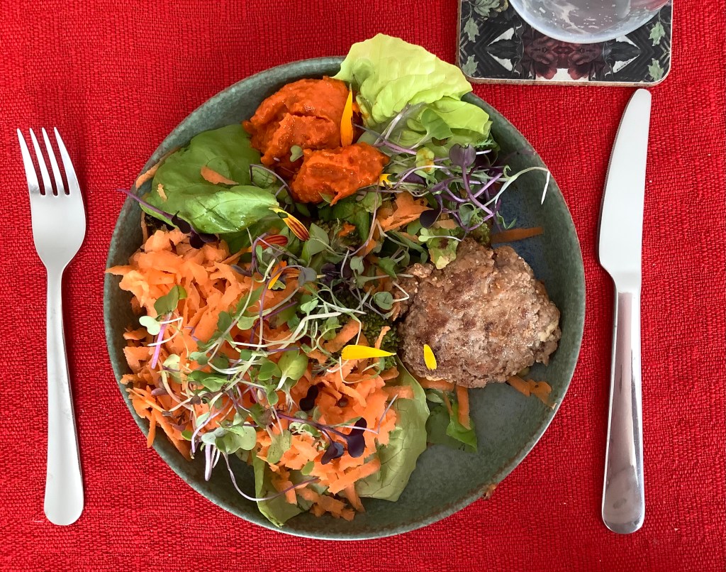 Friday’s lunch was a bright salad with a leftover lamb and feta patty and a big spoon of ajvar. Sunday’s dinner was lamb stew with pearl barley, also from Julius Robert’s book. I added in the rainbow chard instead of cavolo nero and remembered after the photo to add a good sprinkling of parsley. The meat came from our local butcher, the thyme from the garden, and the dish was full of cosy spring flavours.