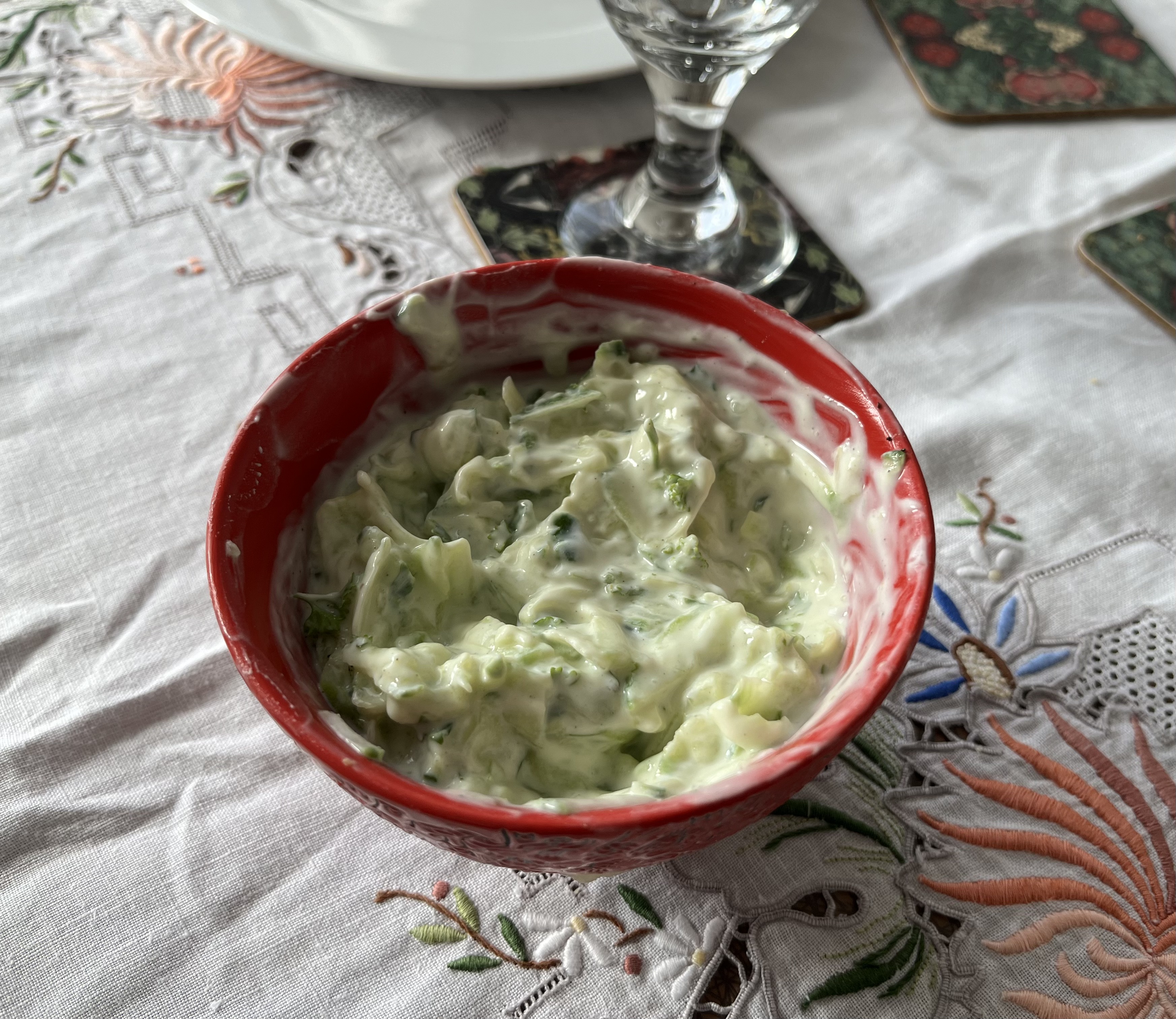There were some spicy chicken ‘rissoles’ on Monday, and to go with them was a yoghurt, cucumber and herb dip and some plain steamed broccoli.
