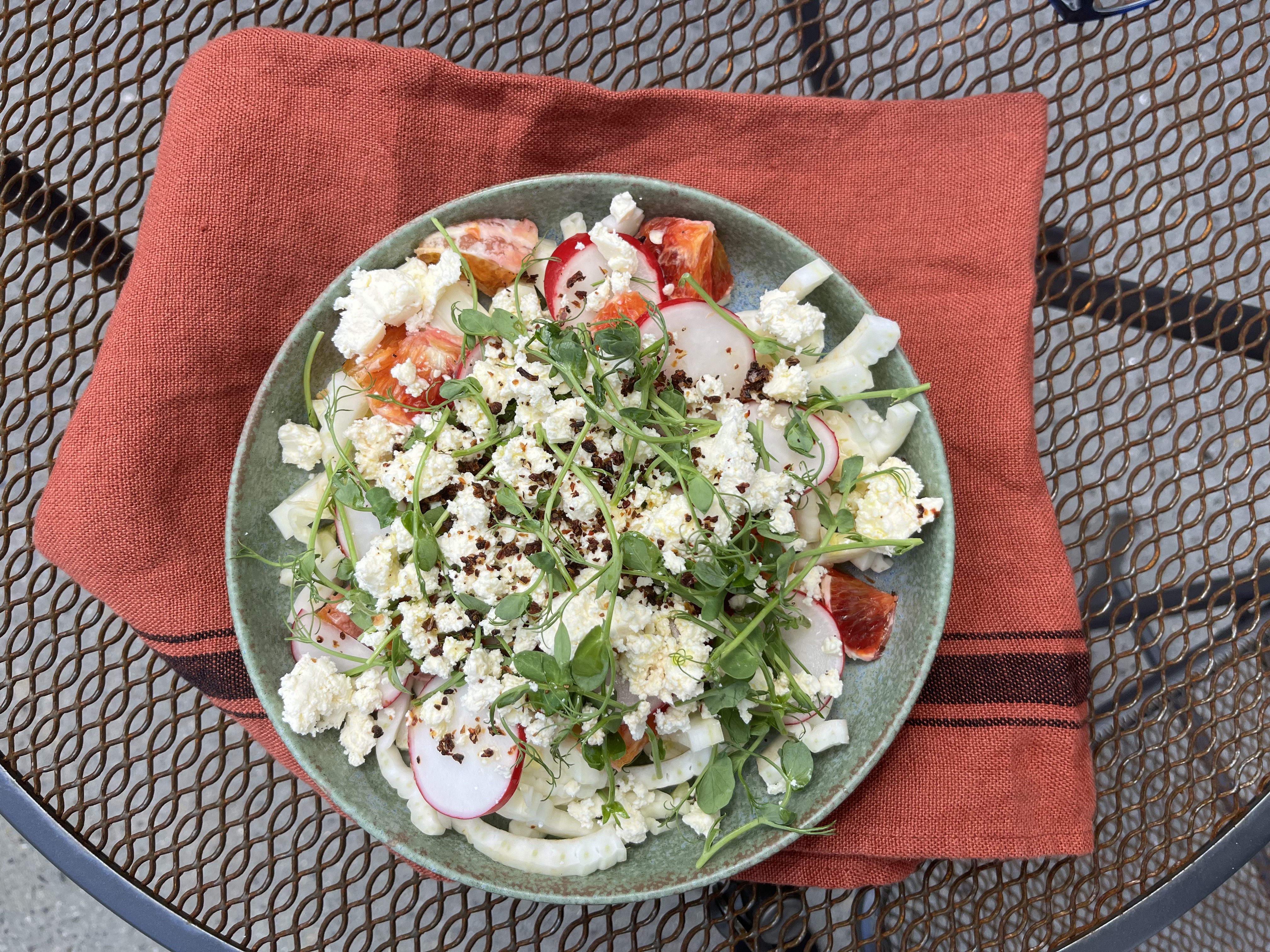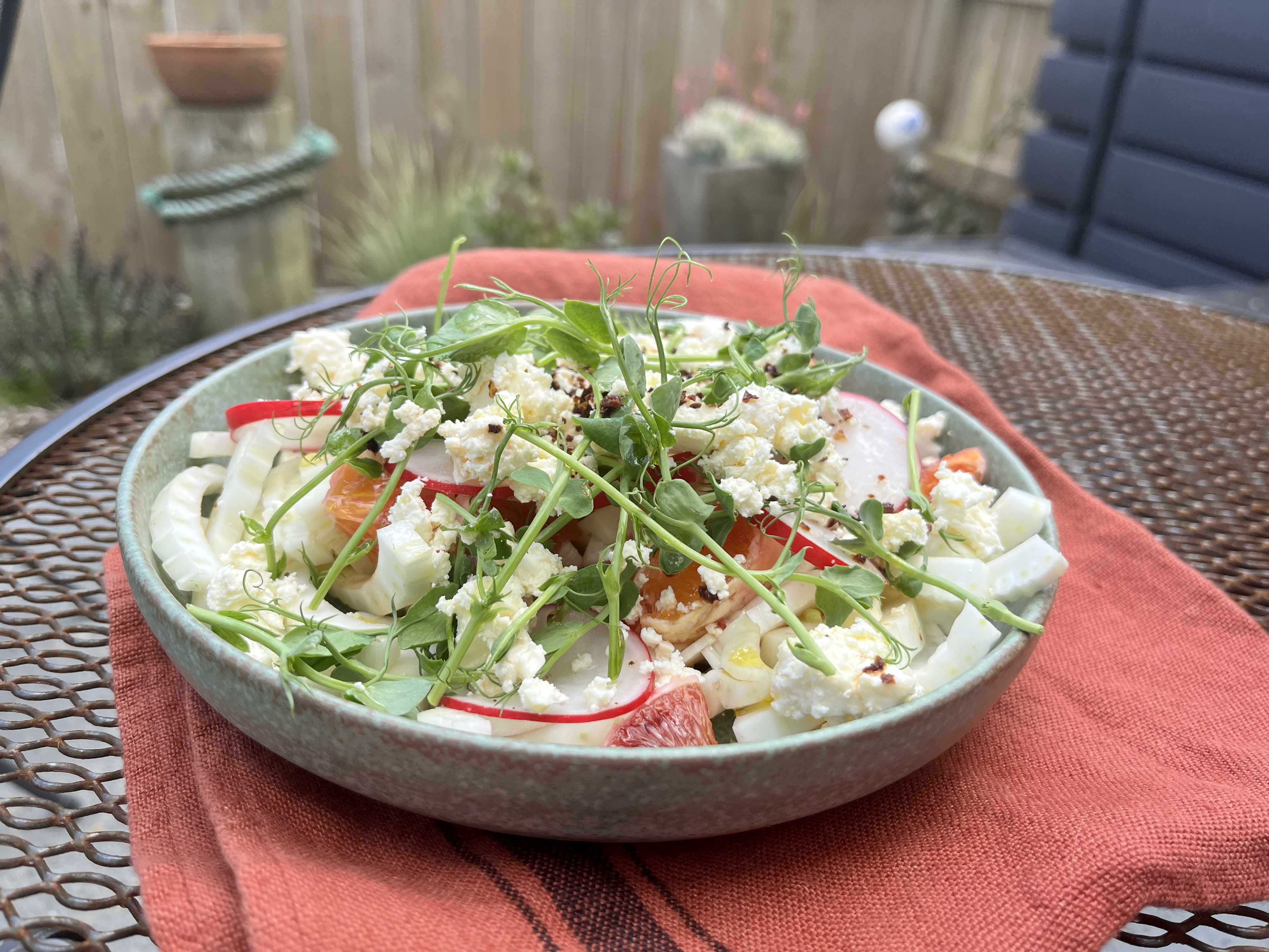 Today for lunch I made a salad with the rest of the fennel, a large radish, one of the blood oranges, pea shoots and feta, with a sprinkling of red capsicum flakes on the top.