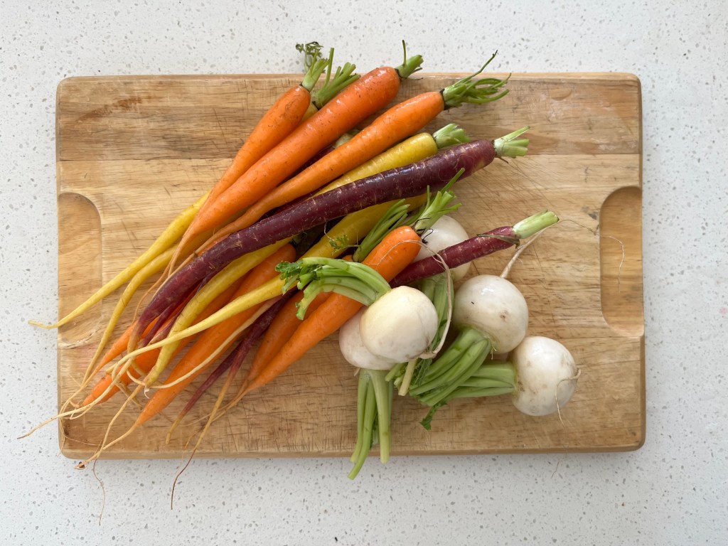 Finally, I roasted the baby turnips and baby carrots tonight, as well as cooking the asparagus to have with venison sausages and potato and kumara mash.