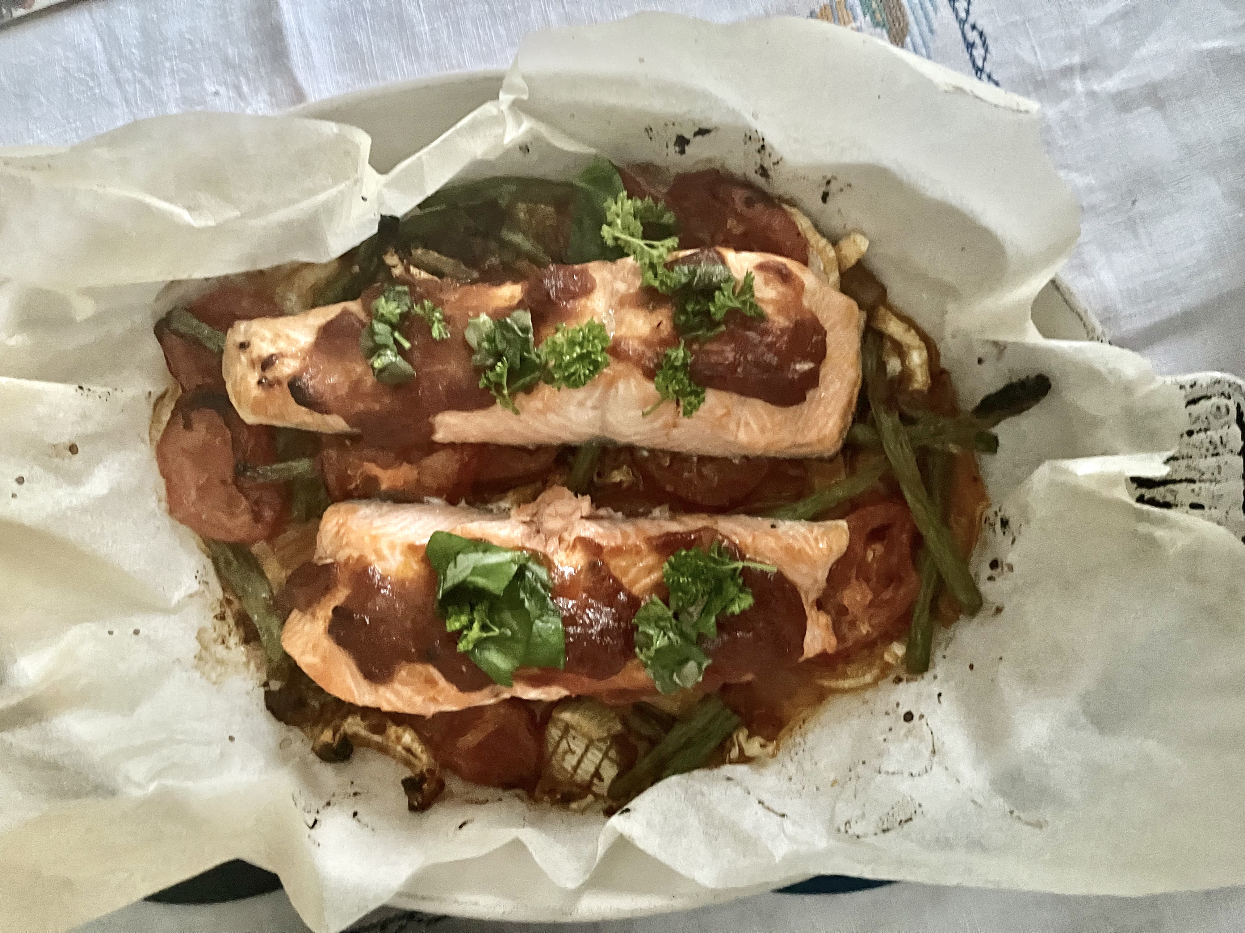 Anyway, on Saturday, I used up some of the giant fennel with green beans and tomatoes to make the puttanesca style salmon bakefrom Ottolenghi’s Comfort. The fennel was my addition, as I think it goes so well with fish. The picture on the right does not do the dish justice, which was really good and a ‘do it again’ one. We had some of the asparagus on the side.