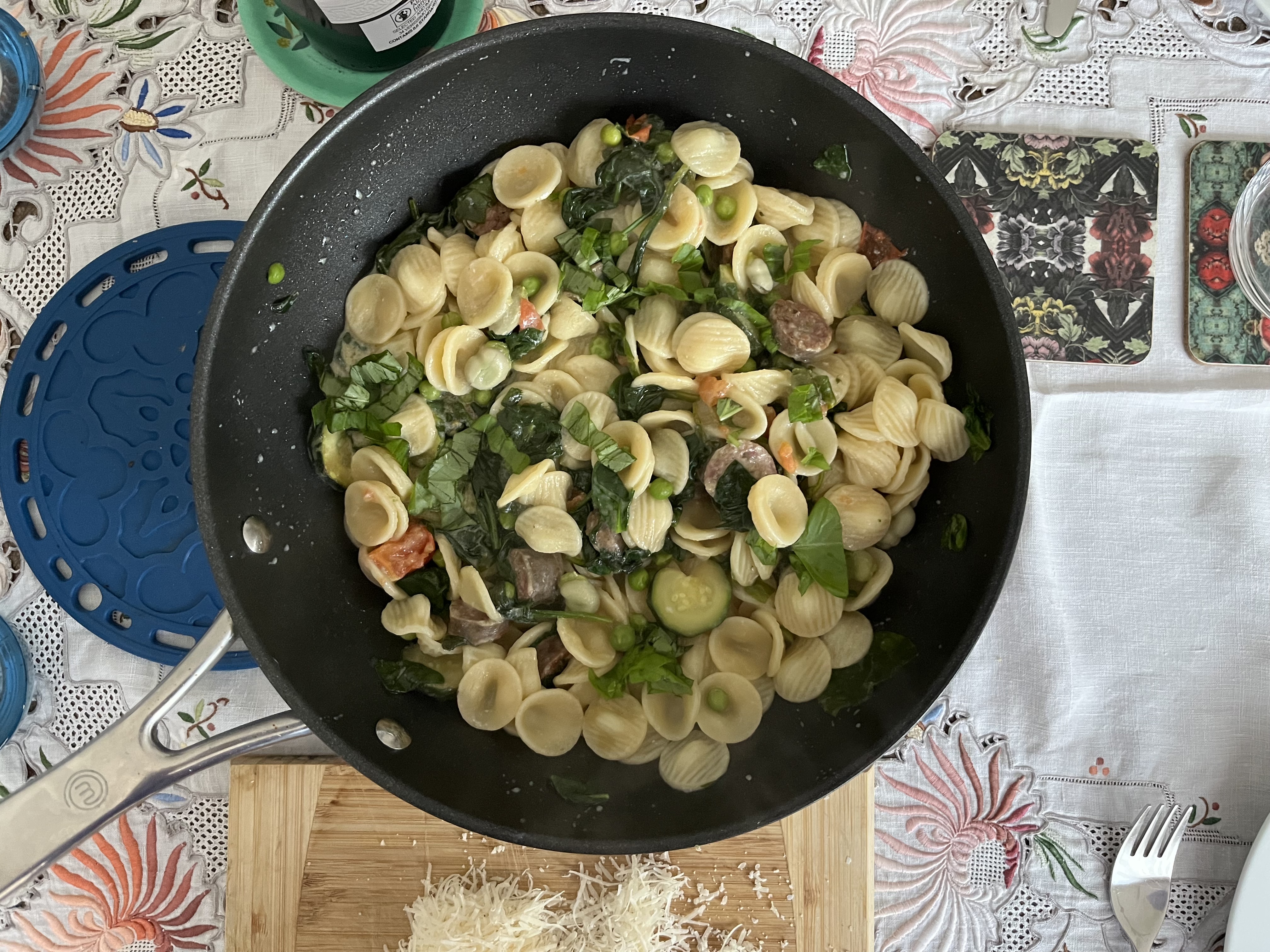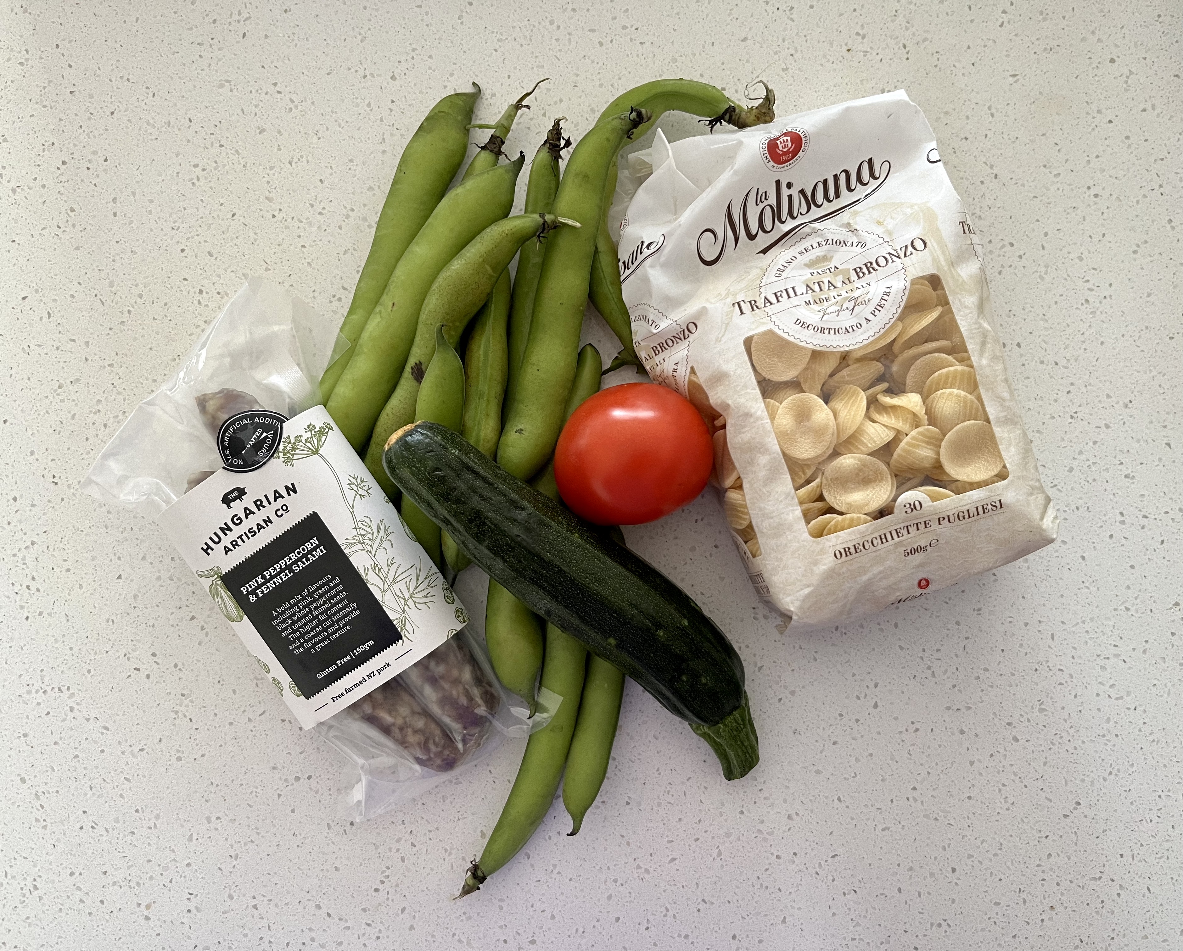 Every week, there is usually a ‘use up things from the fridge’ meal like this pasta with salami, broad beans, left over peas, a courgette and a tomato. I added fresh basil and some left over sour cream as well. Left overs made a good lunc