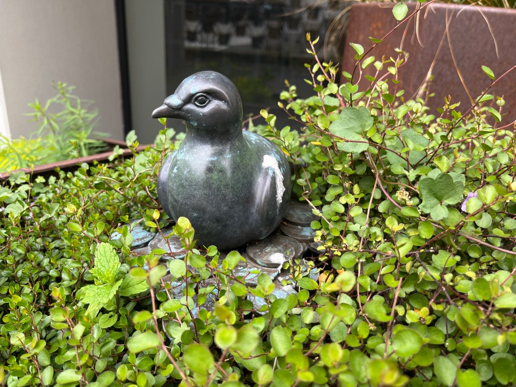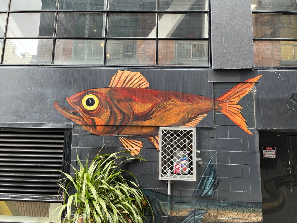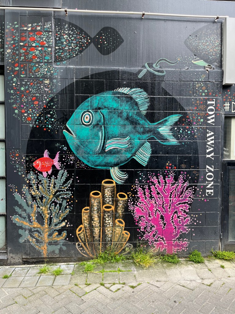 The other week, I was walking up Egmont Street and took my time to take a look at what there is on the walls…and of course this bird nestling in a large pot. It could be a kererū but happy to be corrected. There are some large, colourful fish covering one wall, brightening up the street and looking as if they don’t want to be caught and eaten.