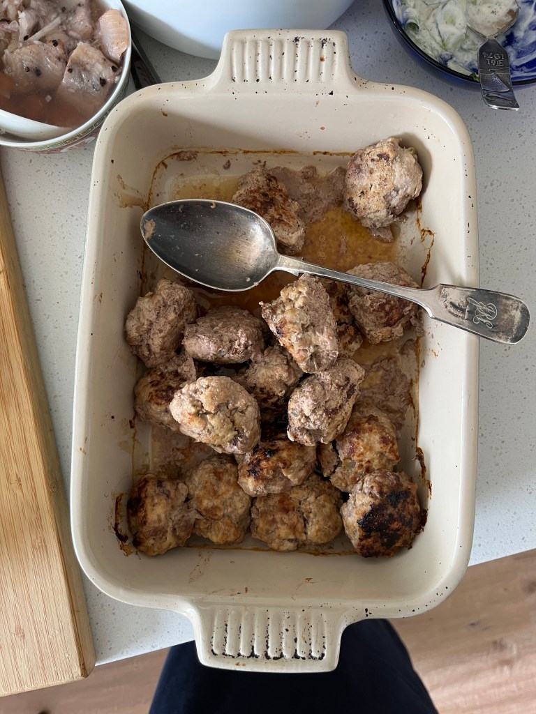 Below is the end of the Janssons, the left over meatballs and dessert. I made the left over strawberries into a compote which went well with ice-cream for dessert and yoghurt for breakfast. We opened our presents, and suffice to say, we were both very happy with what was left for us under the tree.