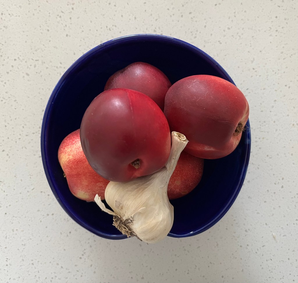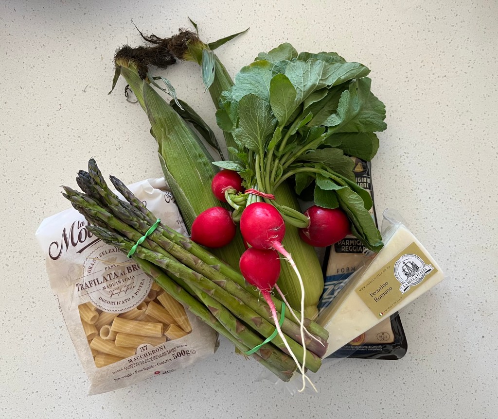 Our Wonky Box got delivered on Christmas Eve, so I just put everything away without taking a picture. There was caulilini, “Ilam Hardy Potatoes”, a bunch of baby carrots, aubergine (eggplant), two baby cos lettuces, a leek, a bunch of pak choy and two red onions. I topped this up with these gorgeous looking radishes, sweetcorn, asparagus and mushrooms (not pictured), as well as picking up more pasta, pecorino romano and parmesan. Of course, something always gets forgotten, so I had to go out again for necessary garlic, a bag of nectarines and blueberries from our local greengrocer.