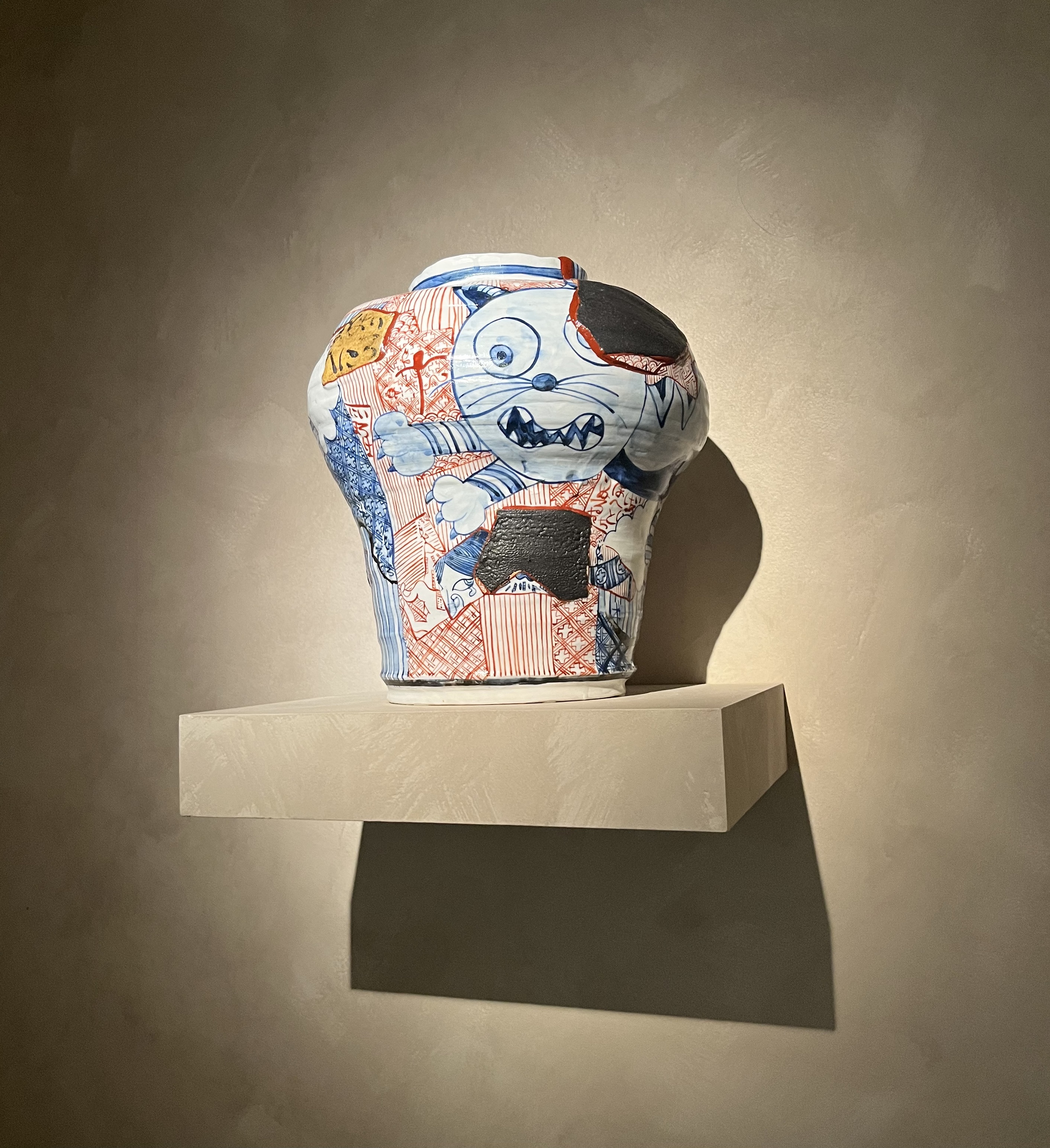 I also enjoyed Whenua Whatu Māori ceramics from the museum’s collection, particularly this one by Aaron Scythe, with the cat. Scythe studied and worked in Japan as you can see from the design.