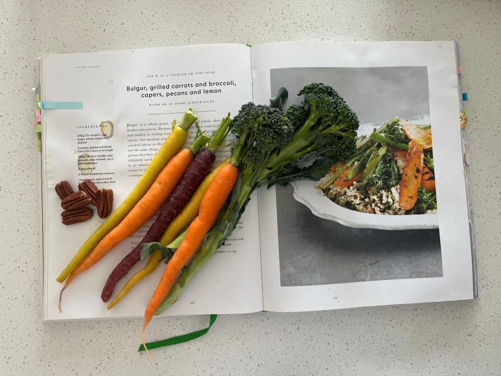 So to the book, full of salads of all sorts for all seasons. If you like reading a cook book as much as cooking from it, then you will probably enjoy this. The descriptions ring out as much as the fresh ingredients. For this post I decided to make the bulgur, grilled carrots and broccoli, capers, pecan and lemon salad which we had with chicken. I do love a grain based salad, and leftovers make a perfect office lunch.
