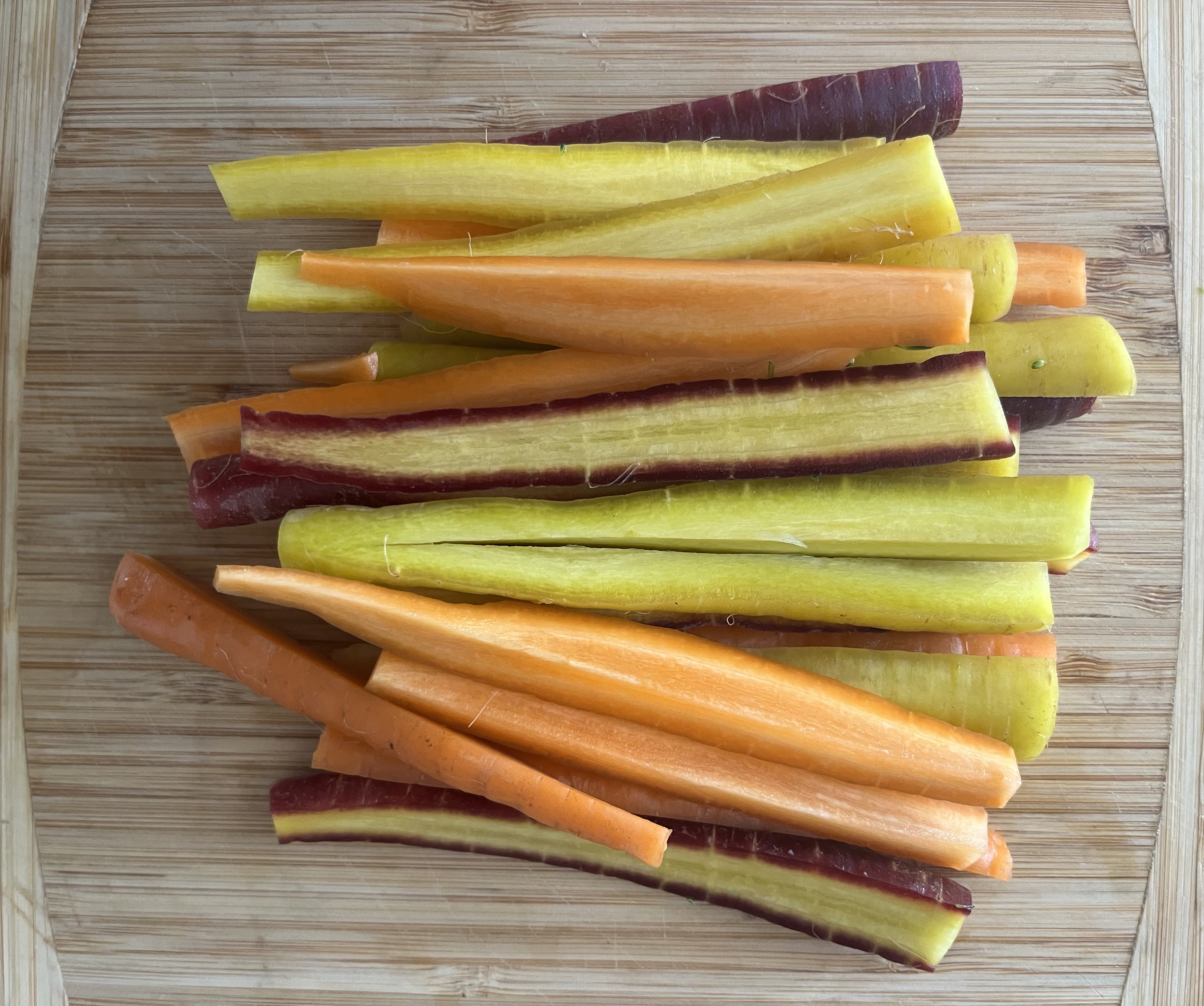 You can see from the picture above this is not the first time I have made this, with splashes of something showing this is a well used book. I used miniature carrots of three different colours this time around, and was able to find some tender-stem broccoli this week.