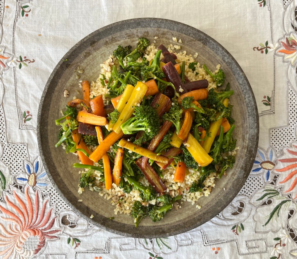 Add the toasted and roughly chopped pecans, mint, and capers to the bulgur, and mix well before topping with the vegetables. This is a lovely, fresh and tasty dish, which could be made in any season. So simple, yet bursting with flavours and goodness. The recipe can be found here.