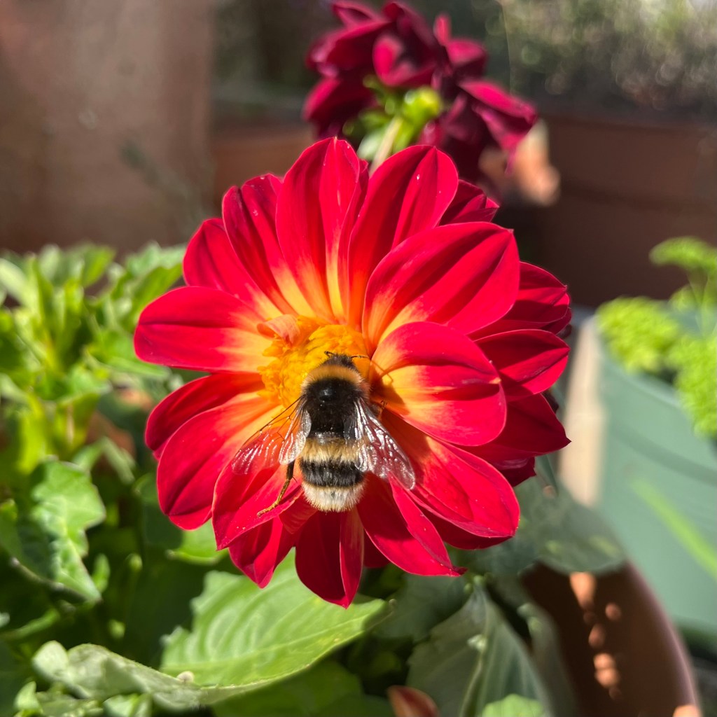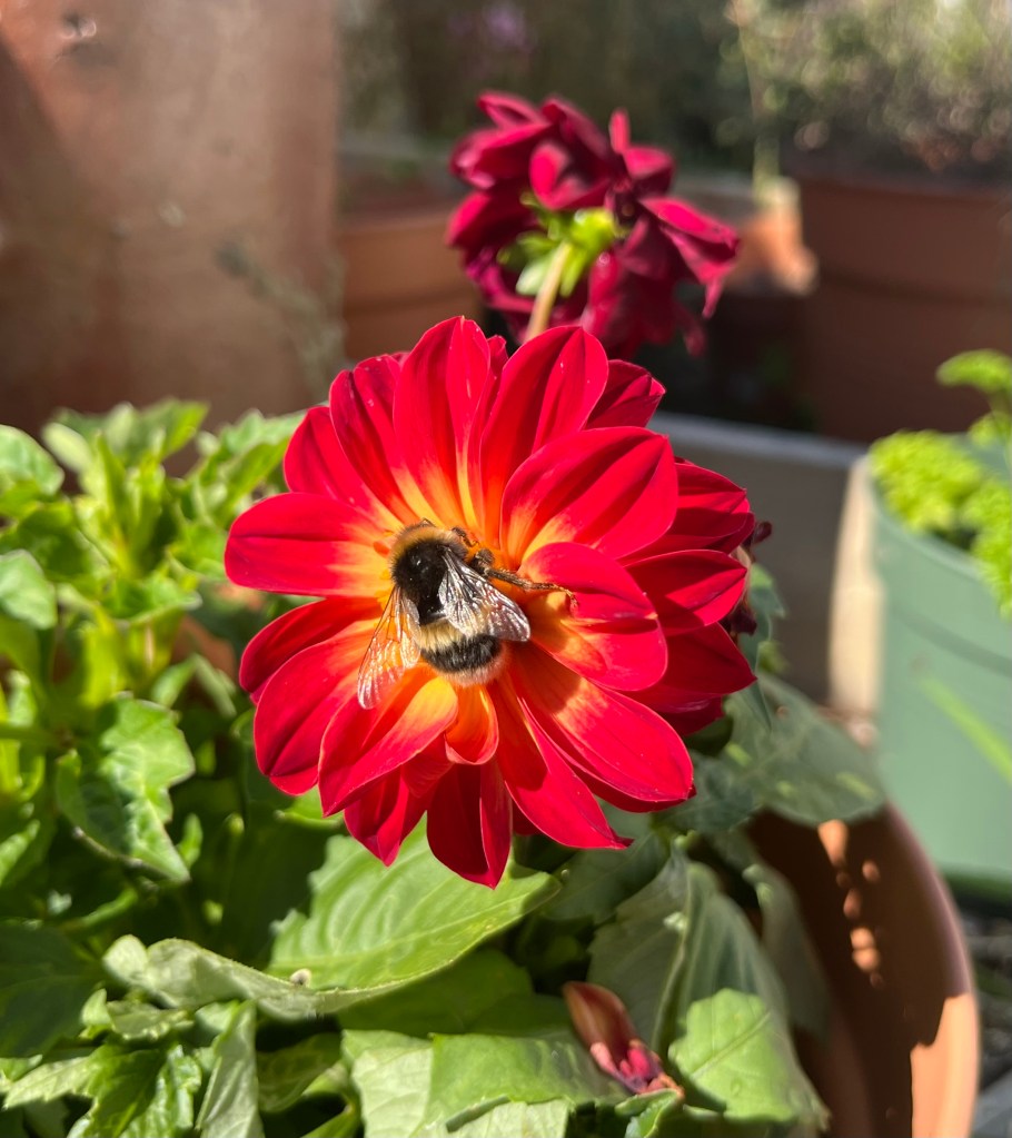 If we were having coffee…or even a cup of tea…I say I am pleased with the dahlias I took a chance on from the garden centre, and especially pleased to see a bee visiting. You smile.
