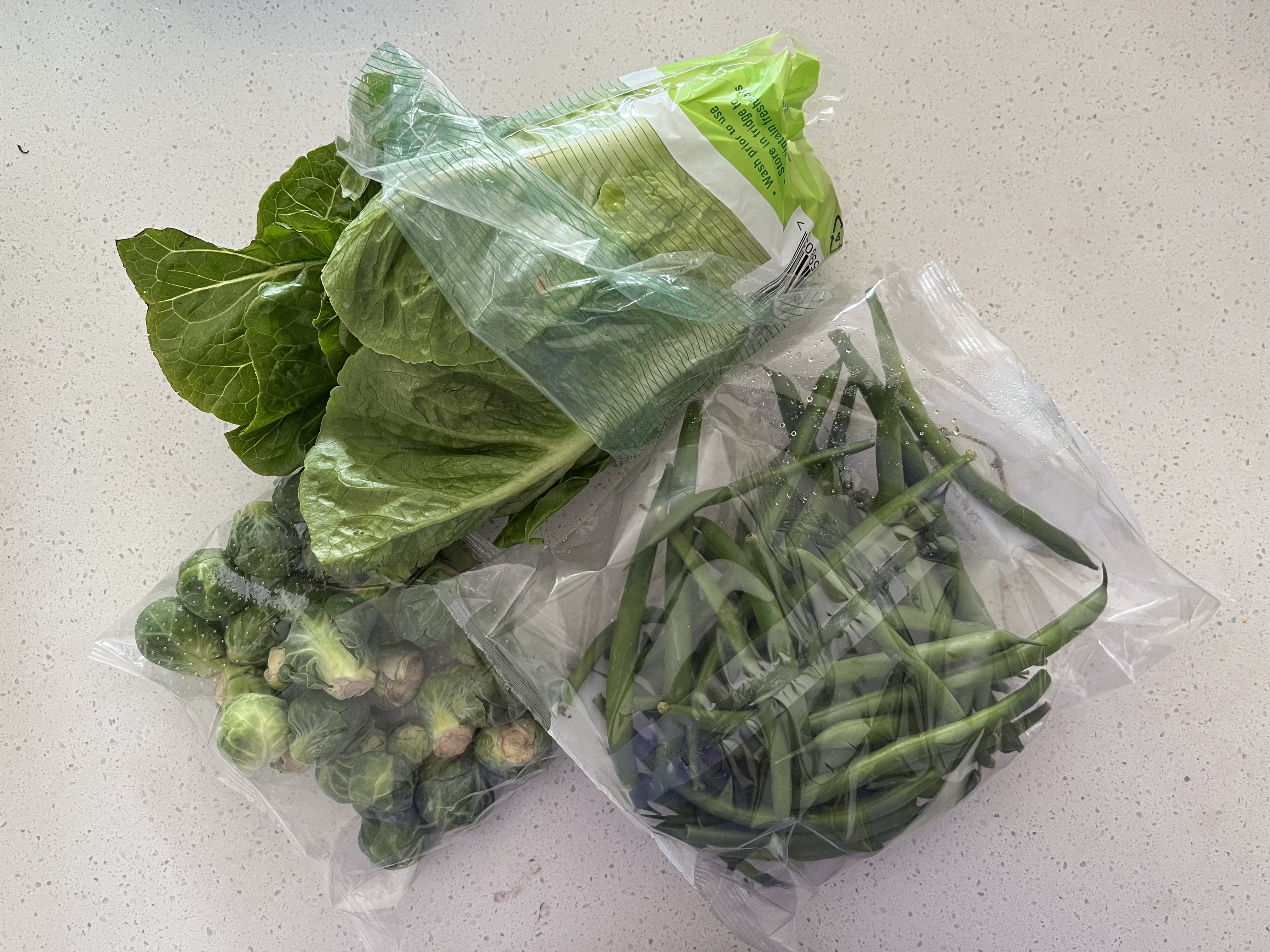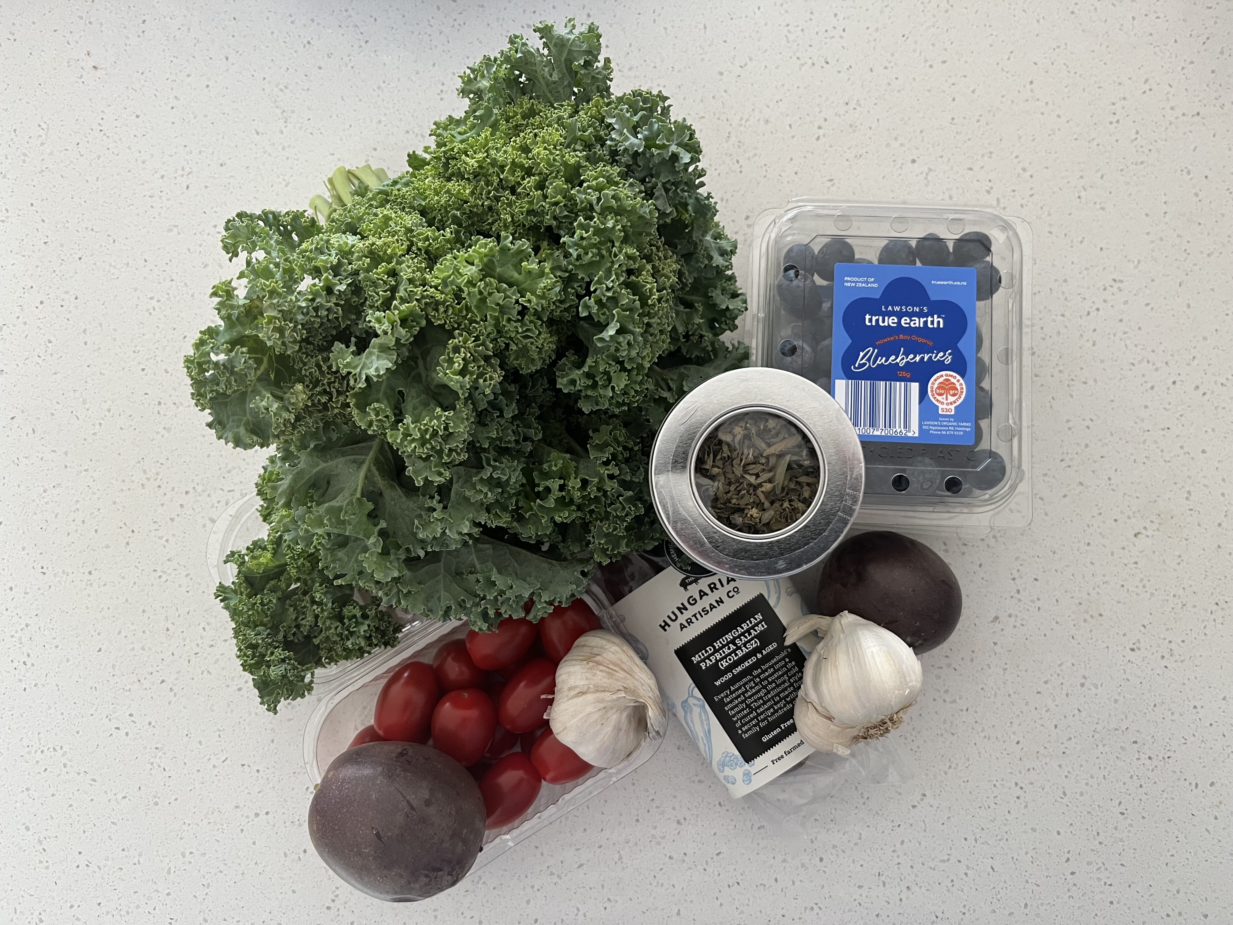 The Wonky Box delivered up a lot of goodness this week. There was another leek, three capsicum, a bunch of radishes, mushrooms, courgettes and carrots along with a lettuce, a bag of green beans and a small bag of Brussels sprouts (is it that time of year already?). I added some ruby red kiwi fruit and limes to the box as well. I picked up some more blueberries, a couple of passion fruit, garlic, tomatoes, a bunch of kale, some salami and Mexican oregano for a dish I made on Sunday (more on that on Wednesday as part of the BKD Cookbook Club).