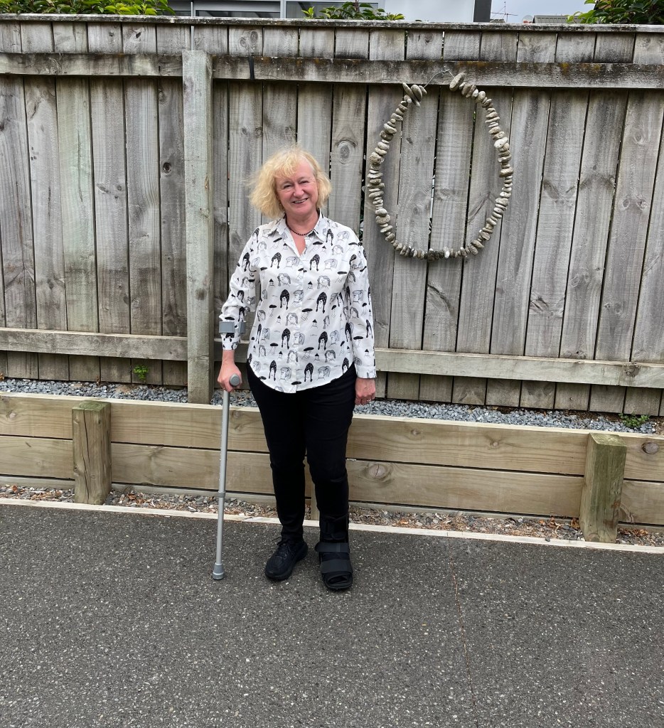 It’s Monday evening, dinner has been eaten (wonderful left overs from yesterday’s dinner), the dishwasher has been loaded and the prospect of a nice relaxing end to the day is on the cards. My foot is of course still encased in the moon boot, and I also now have a crutch to walk with as advised by my physiotherapist. This has made walking so much easier and given me a lot more confidence – I even managed to get on and off buses with it. Anyway, here I am with trousers tucked into the moon boot, the crutch and my shirt of hair styles.
