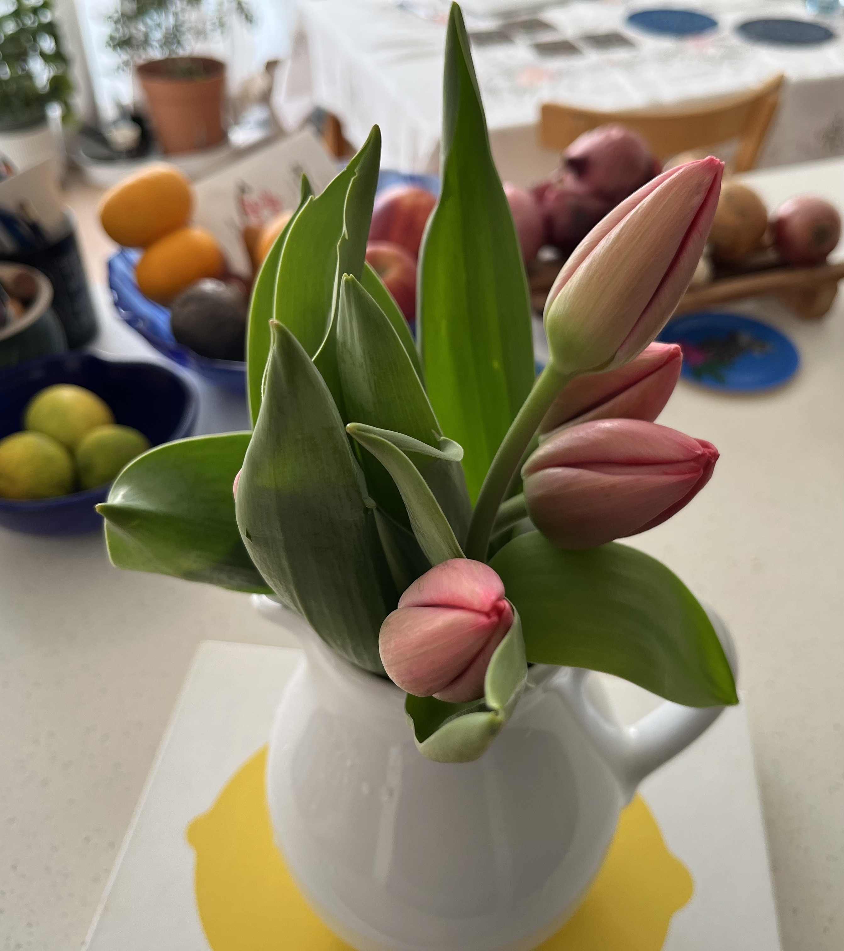If we were having coffee…or even a cup of tea…I would show you the pretty pink tulips I bought and you say how lovely to see on this grey and wet day.