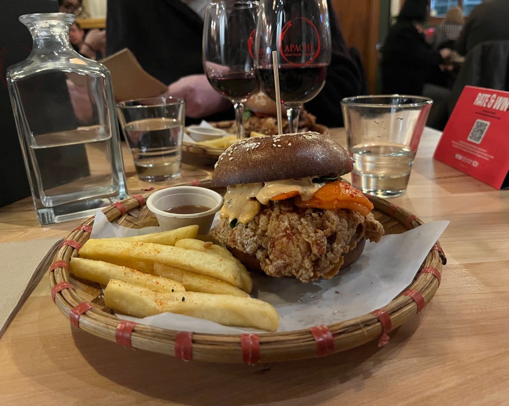 Wellington on a Plate has started, and tonight we went for our first Burger Wellington at Apachè. Their Banh Ga was a spicy fried chicken with Vietnamese paté, Asian herbs, delcious crunchy pickles and burger sauce in a Brezelmania potato bun with, of course, chips. It was very good, rich and full of all sorts of flavours. I recommend you go hungry!