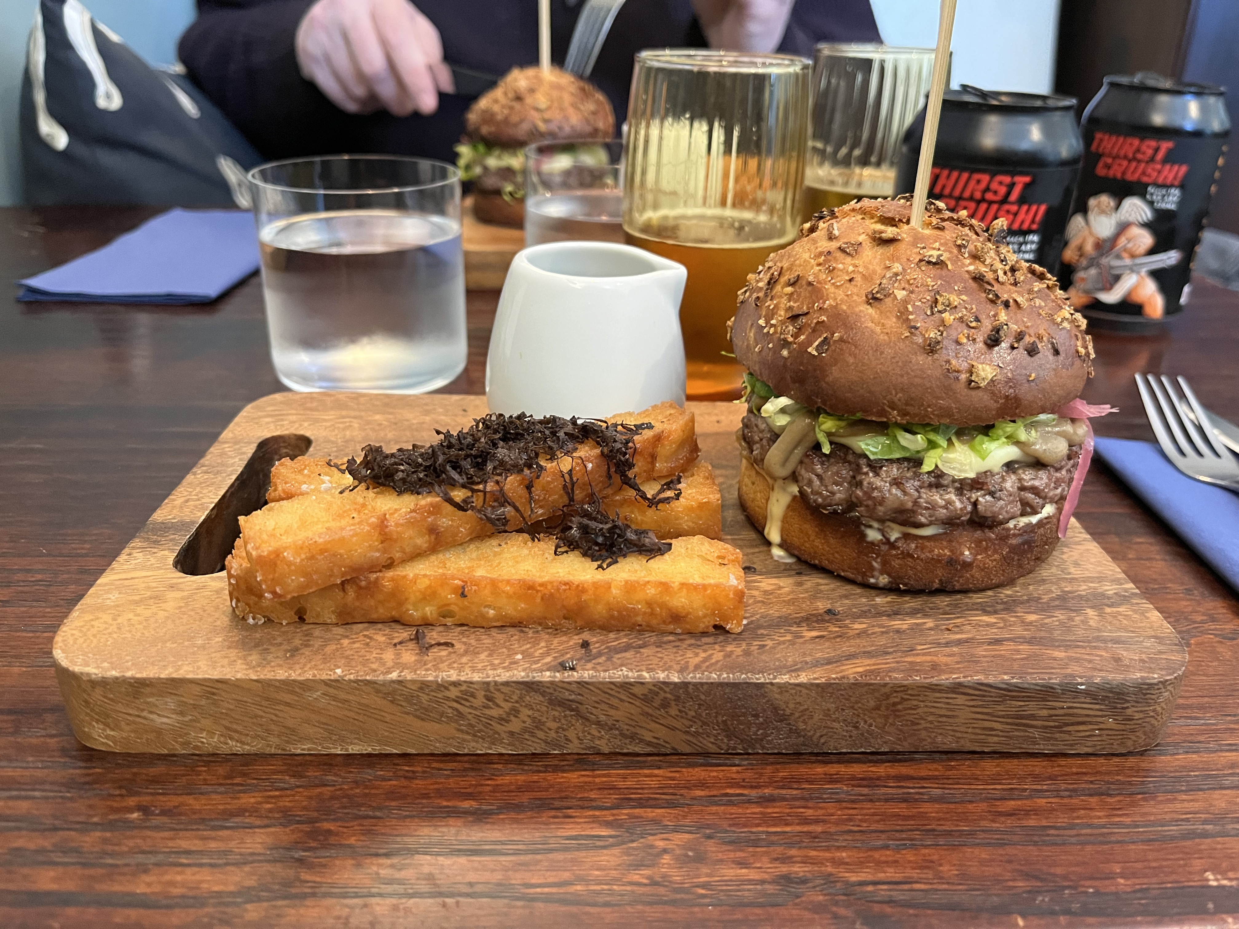 For Saturday lunch, we headed to Jano Bistro, we last visited for my birthday. Their burger was inspired by French onion soup, and was probably the best burger I have ever had. This was a Conscious Valley BBQ brisket and rib beef patty with smoked onion jam, cheese blend slice, cos lettuce, pickled onions, Conscious Valley beef tallow mayonnaise and foraged and fermented cep mushroom ketchup in a housemade crispy shallot milk brioche bun, with rösti fries and onion gravy glaze, and I also opted for the black truffle shaved over the chips/fries. The flavours were unbelievable, everything perfectly cooked and beautifully presented. The beer pairing, Thirst Crush (Peach IPA) from Double Vision Brewing was an excellent match. We both voted 10/10.