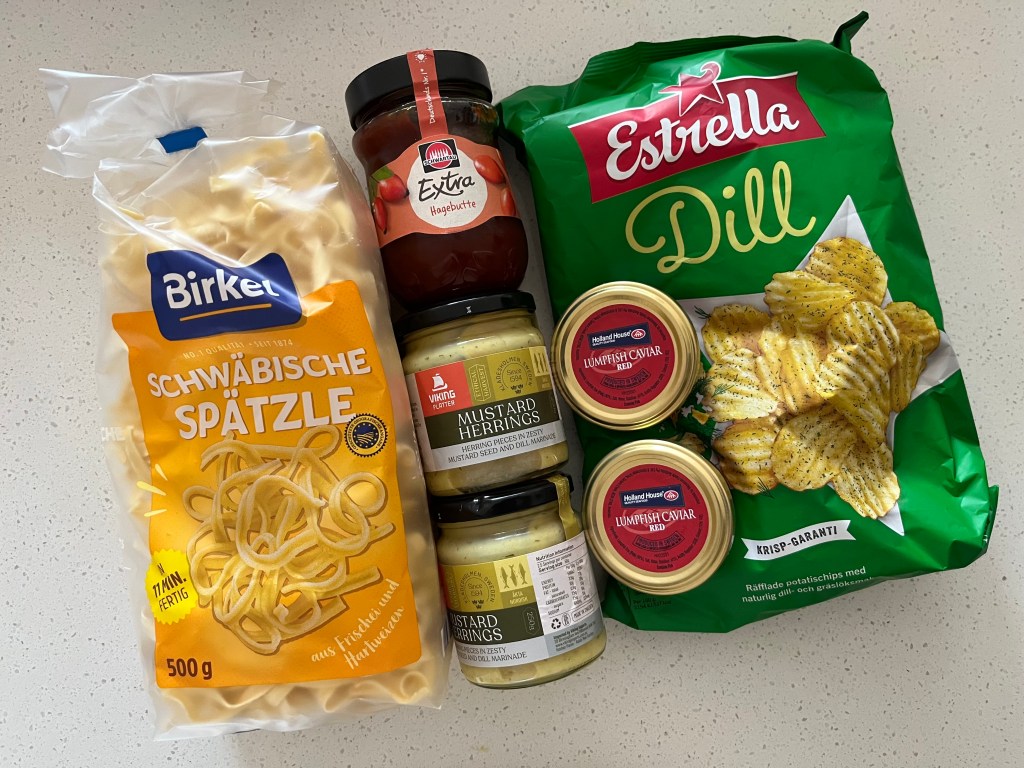 Safka, our now only supplier of Scandinavian food, was having a sale so I ordered up some dill crisps, lumpfish roe, mustard herrings, a tube of kaviar (not pictured) and some German rosehip jam and a bag of spätzle.