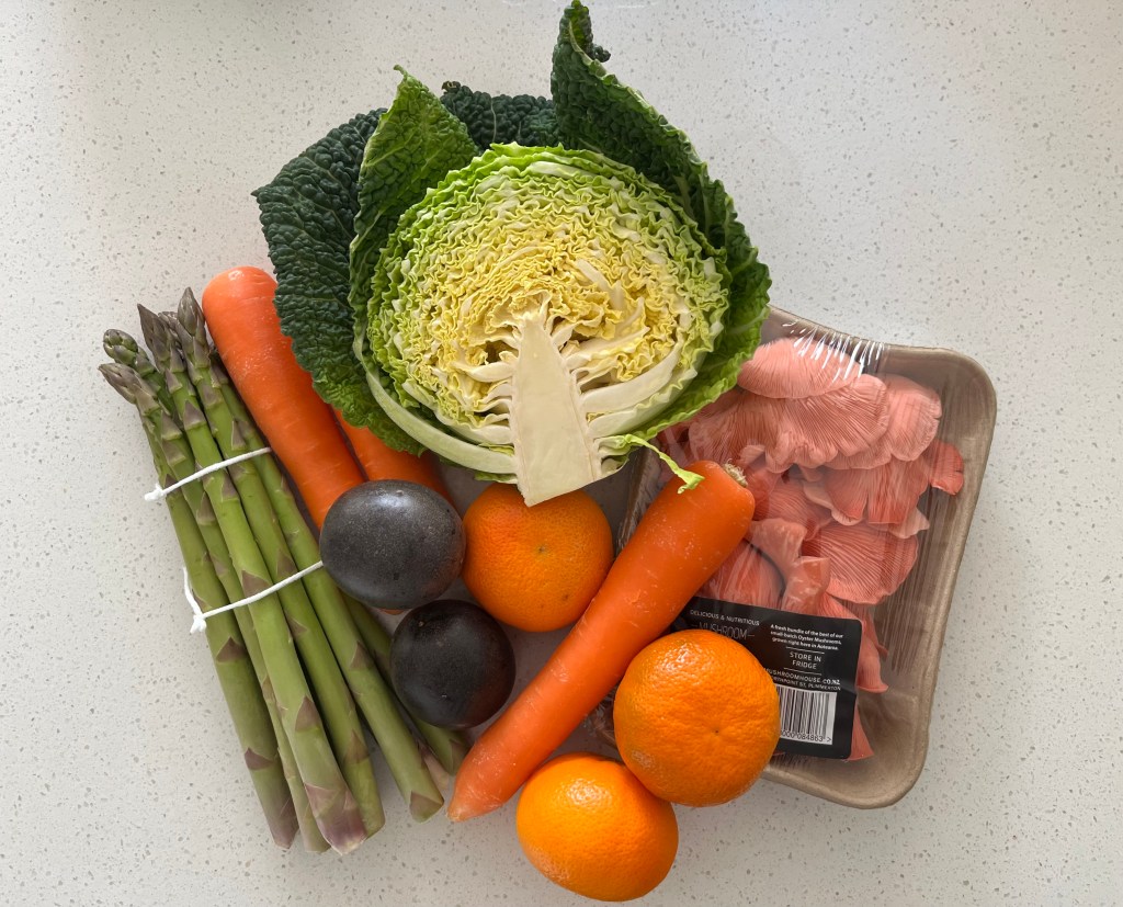 I cancelled the Wonky Box this week, as I really need to use up all the left over produce from the past two weeks (roasted butternut squash, yams (oca), fennel and Brussels sprouts for lunch today and Tuesday for example, with butter beans for protein and seeds for crunch). We picked up half a cabbage, which looks so beautiful, carrots, a bunch of still slightly expensive early asparagus, mandarins, passion fruit and these beautiful pink mushrooms. There was also a bag of rocket, lamb mince, potatoes and some bread for Sunday breakfast.