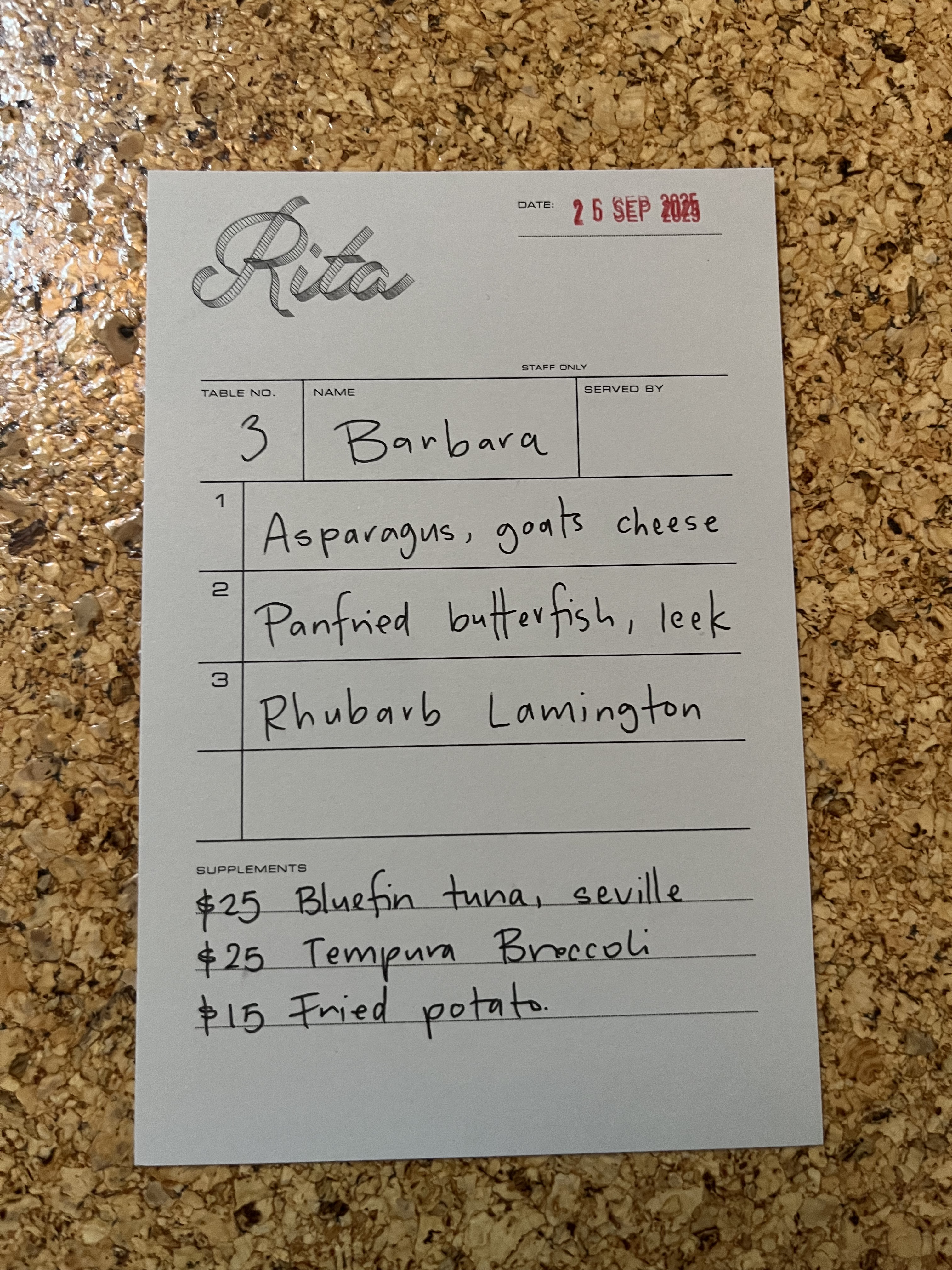 On Friday, to celebrate our wedding anniversary, we went out for dinner to Rita, a wonderful little restaurant nestled in the Aro valley. There is a fixed three course menu to which you can add things. The meal started with these gorgeous radishes with curried butter, followed by asparagus with goat’s cheese, walnuts and a fantastic dressing. We then enjoyed butterfish with very soft baby leeks and greens to which we added fried potatoes. Dessert was a very high class lamington (not your supermarket version!) served with ice-cream. We enjoyed a chablis and a Portuguese white wine along side the food.