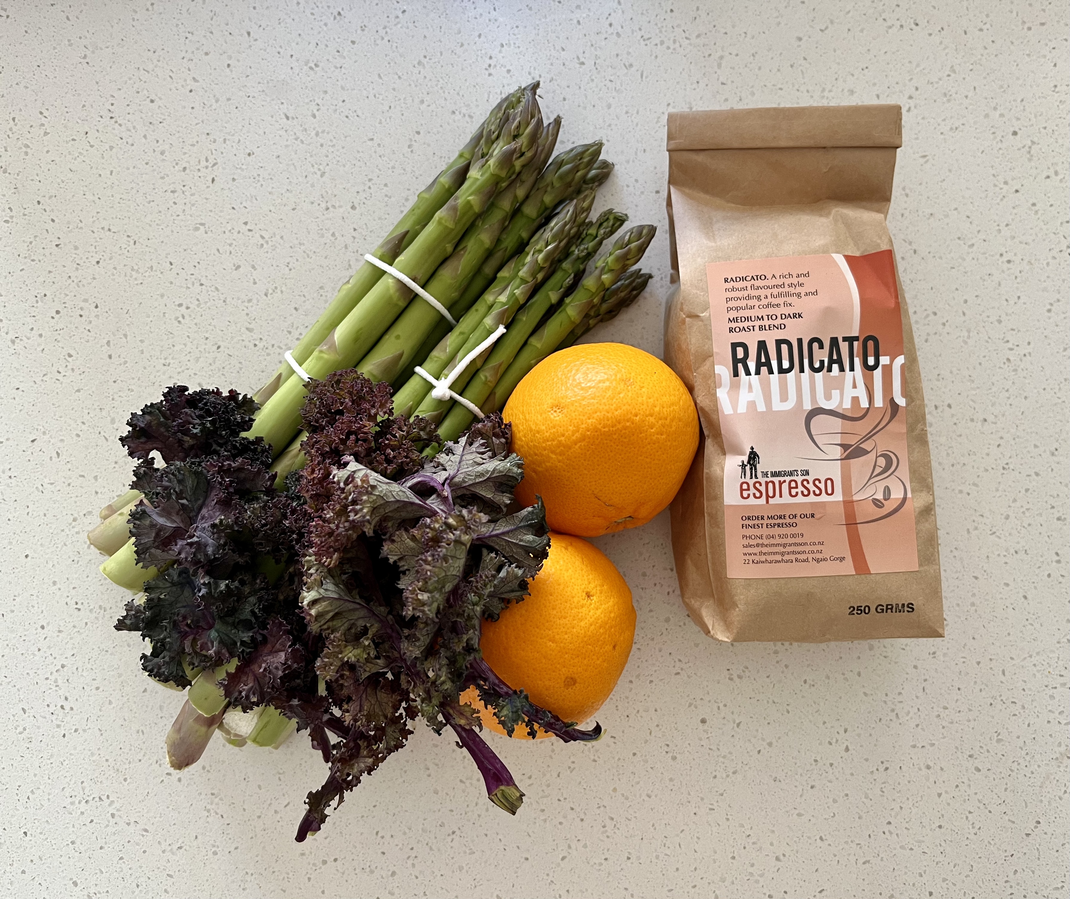 A selection of fresh produce including asparagus, red curly kale, and two oranges, alongside a bag of Radicato espresso coffee, all arranged on a light countertop.