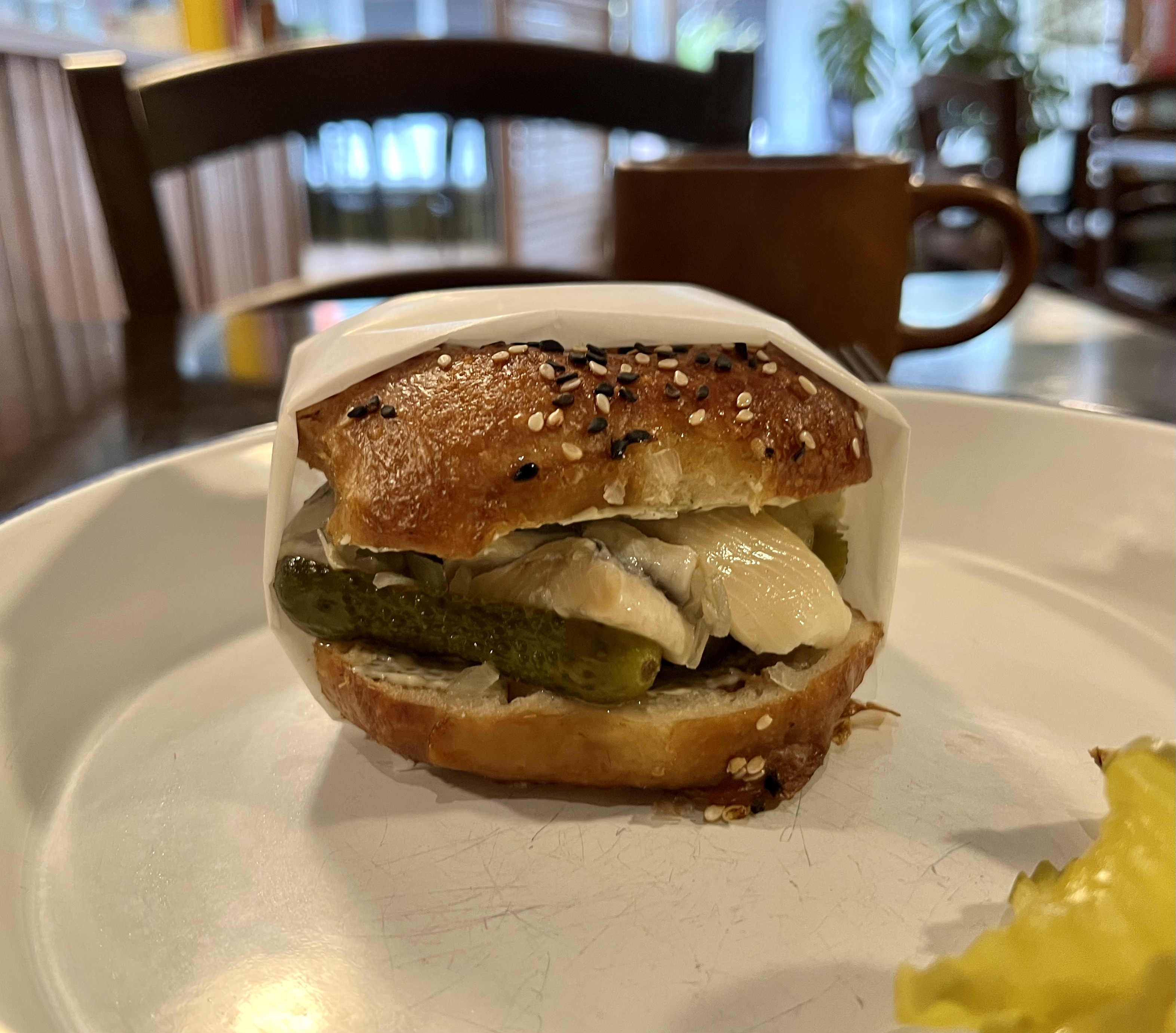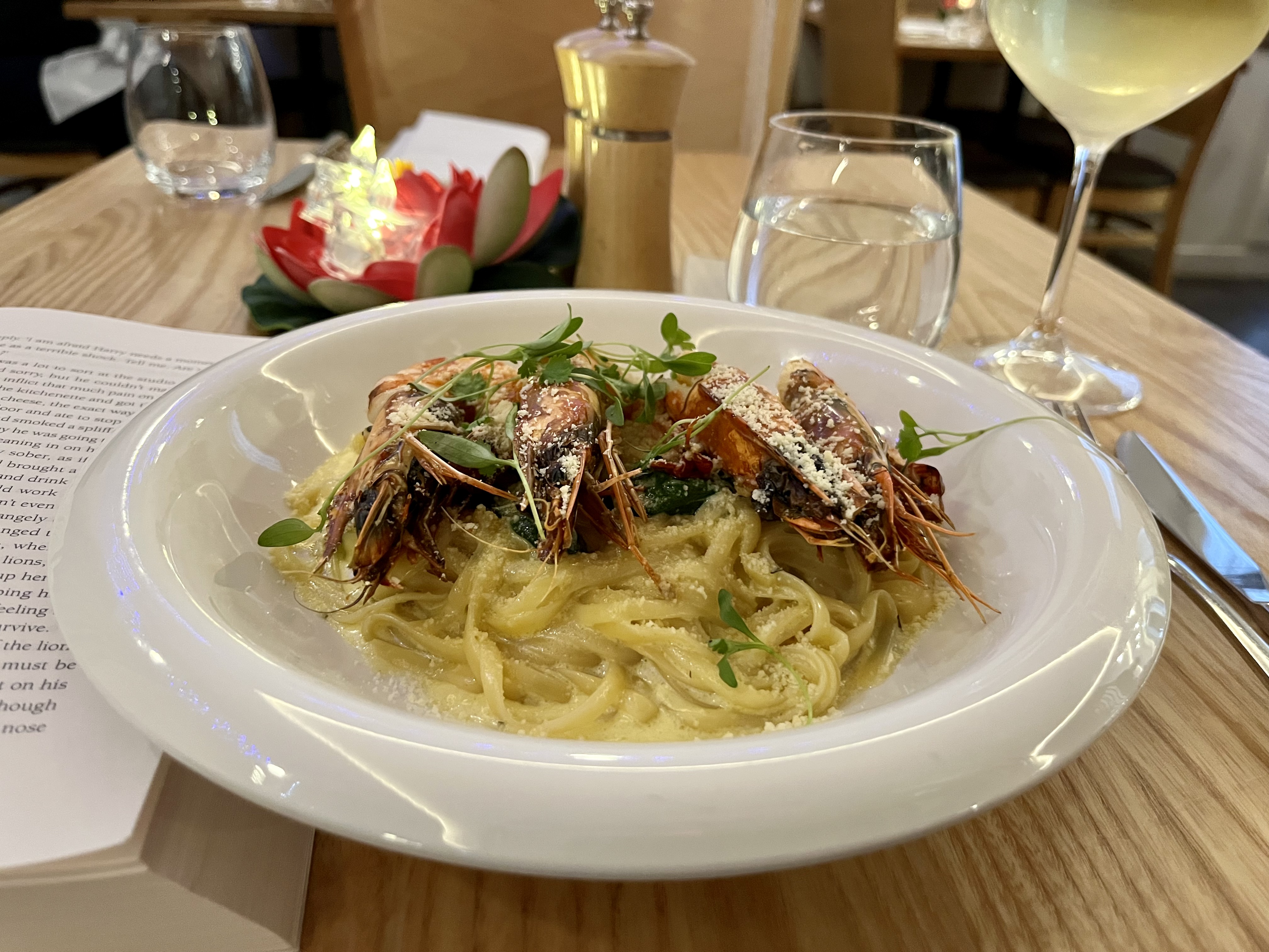 I enjoyed a rather good prawn linguine when I was away, a pot of tea before Pilates on Friday and another excellent bagel, this time with herring and pickles, at Bond Street Deli. We had a Saturday treat of a mini Afghan biscuit, topped with a Jaffa instead of a walnut, and a pasta bake with sausages and tomatoes and topped with mozzarella for Sunday’s dinner with left overs for Monday.