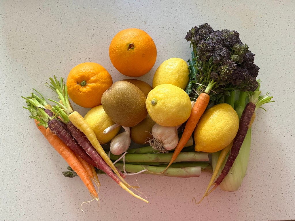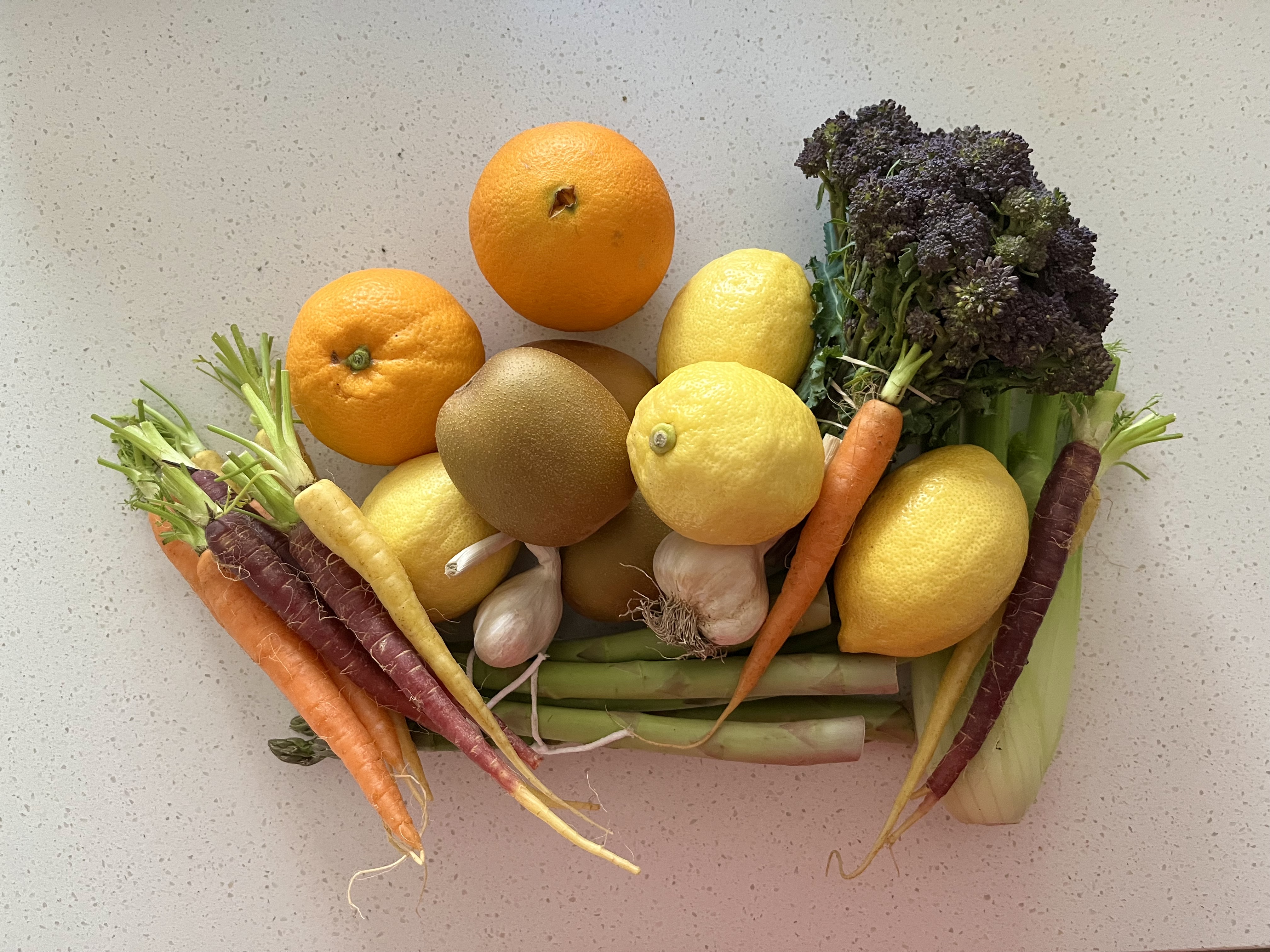I didn’t bother with a Wonky Box again this week, just picking up things I wanted and needed instead. The basket contained a couple of oranges, some golden kiwi fruit, garlic, lemons, a bunch of purple sprouting broccoli, asparagus and some colourful baby carrots, as well as mushrooms, a bag of rocket, turkey mince, pork filet and some chicken and sausages from out local butcher.