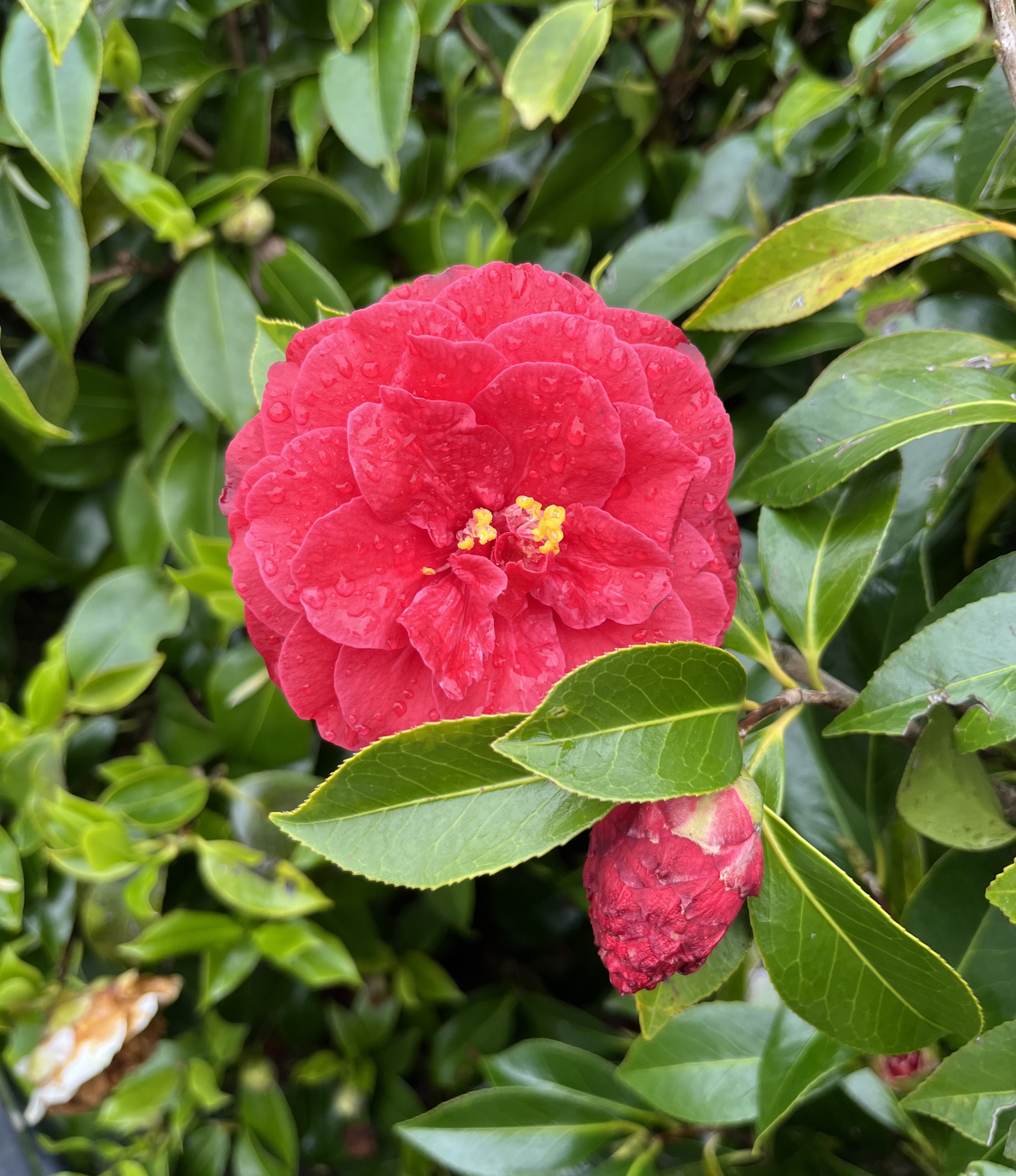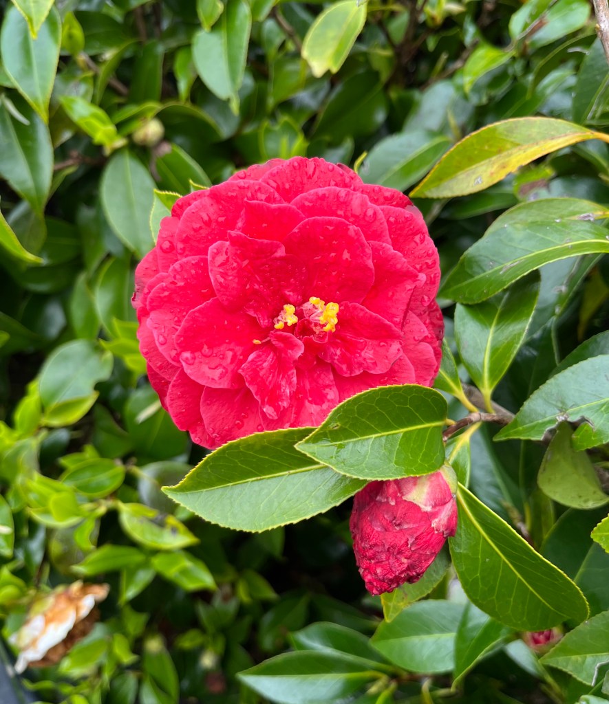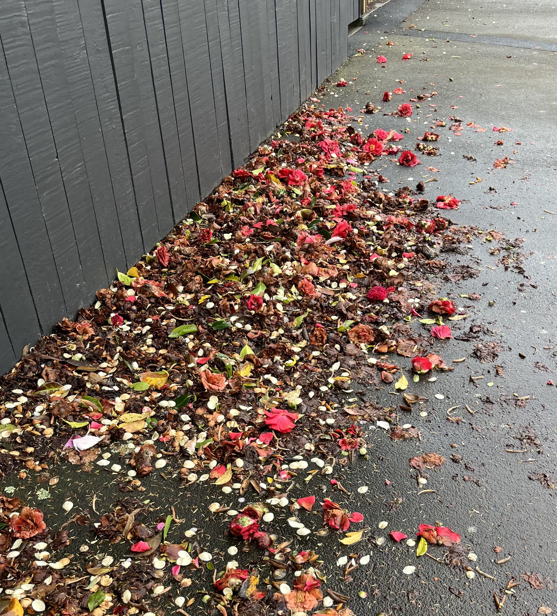 I’ve been enjoying the camellias by the bus stop…and also the pile of petals…though I take care not to stand on those…I do not want to fall and fracture another bone in my foot!
