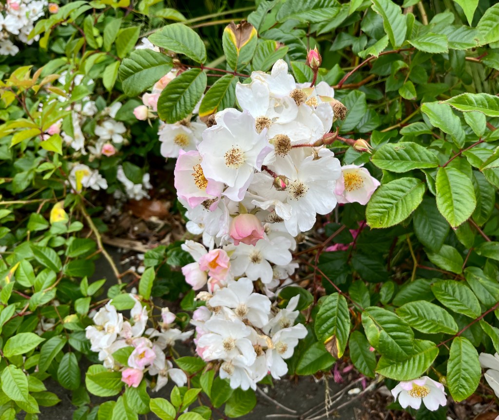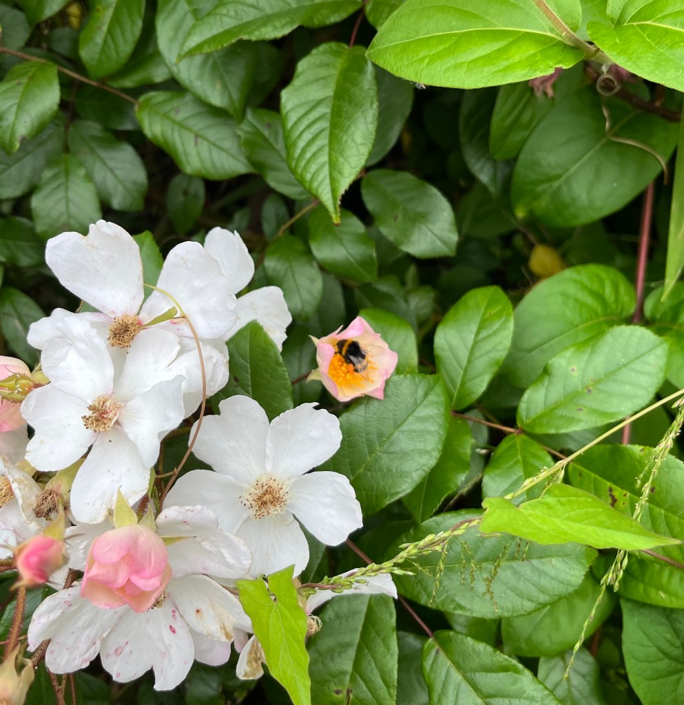 I spotted these beautiful roses next to the bus stop the other day, and a bee enjoying a feast. There are two big bushes, just full of gorgeous flowers at the moment. Makes waiting for the bus almost a small pleasure!