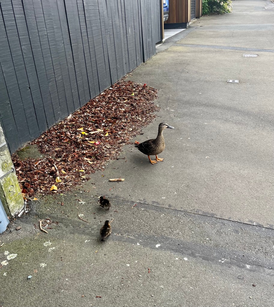 • Meeting Mrs Duck and her three babies (one was hiding for the photo) at the bus stop on Saturday. I saw them walking back to safety and the stream nearby.
