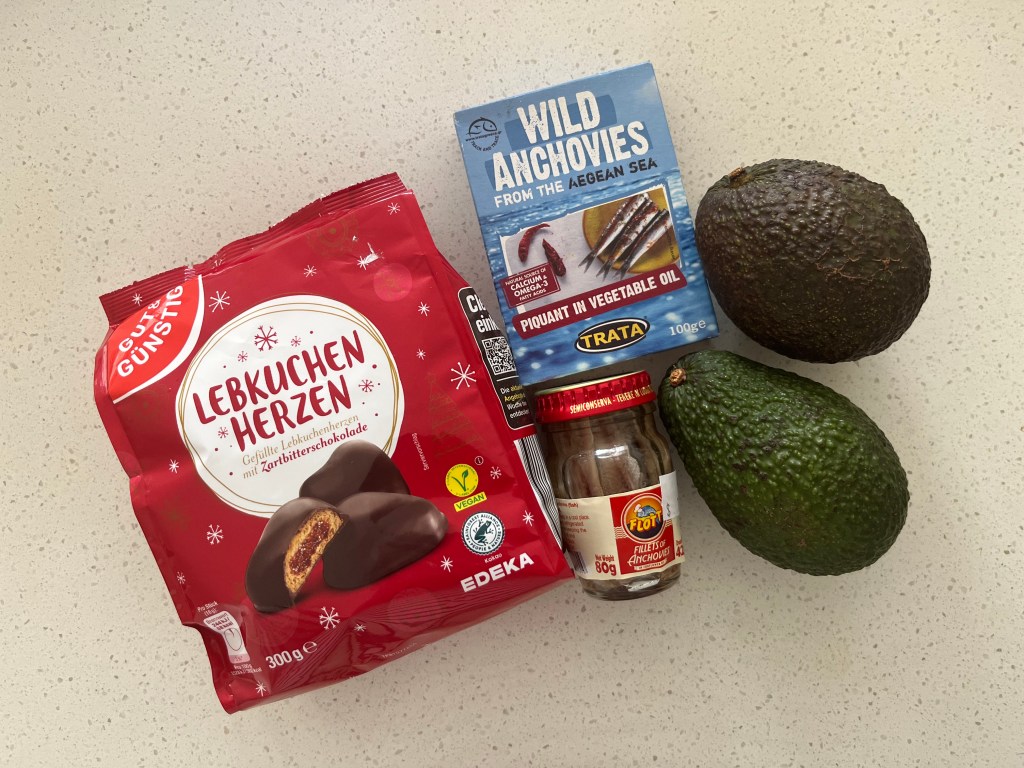 On Sunday we popped into our local deli to get a gift to take to our neighbour, and also picked up coffee beans, these German Christmas lebkuchen because I can’t remember when I last had one, a jar of anchovies and these other anchovies in chilli oil which will be interesting to try, and a couple of avocados from the supermarket.