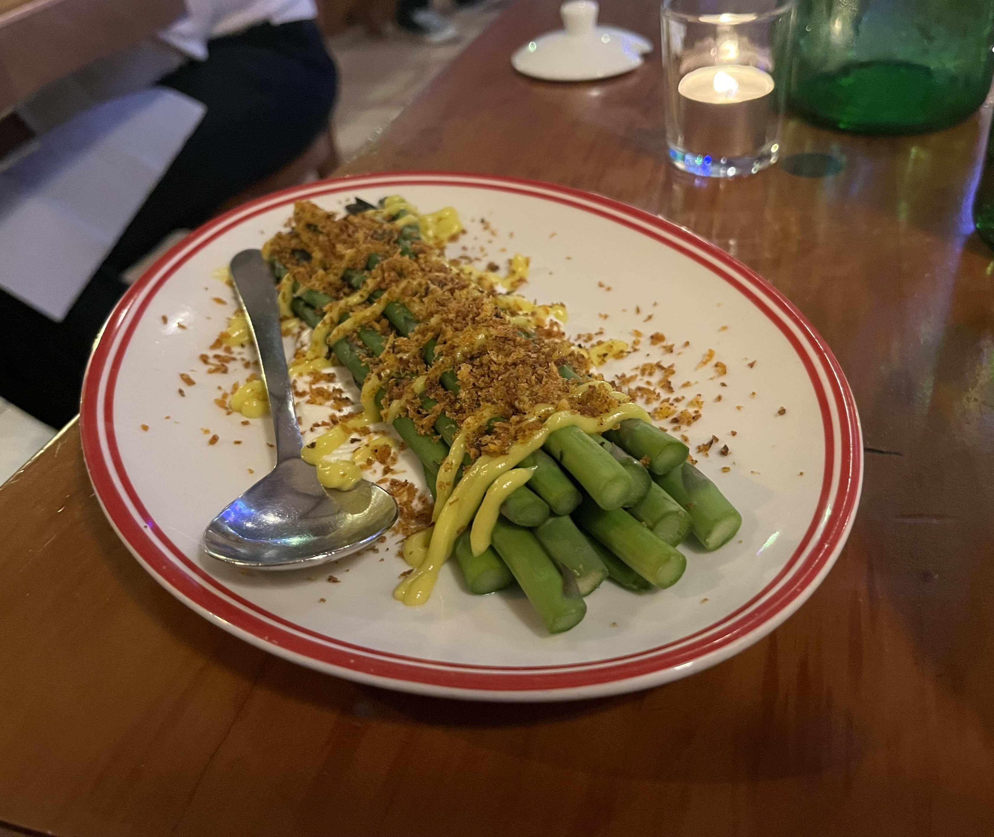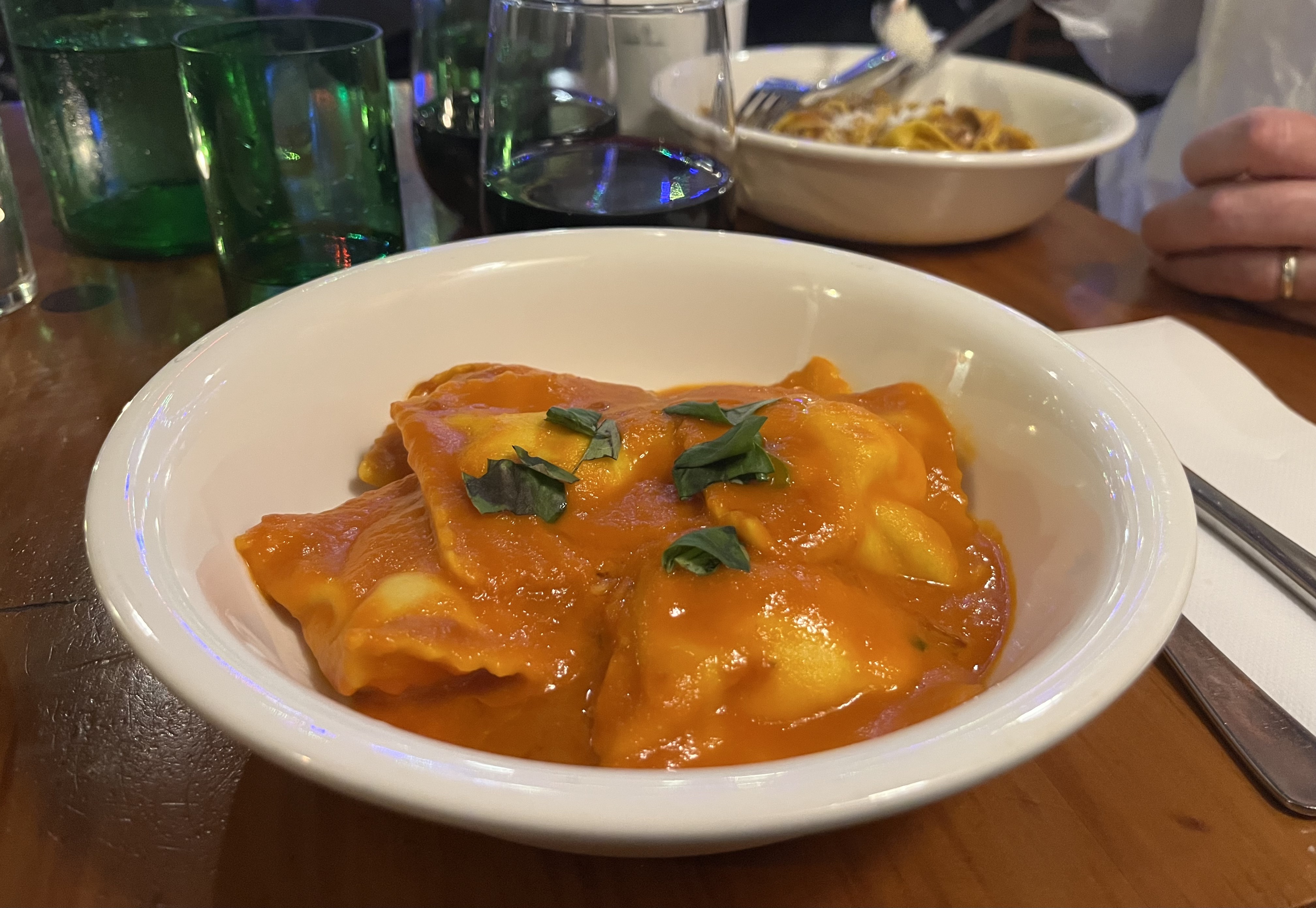On Friday night to celebrate the start of the summer holidays, we went out for dinner to Cicio Cacio Osteria in the Newtown part of the city. I had been recommended this place by a colleague and thought it sounded like a good place to try. Bread is brought to the table automatically, and we ordered a half carafe of the house red to have with our meal. I started with the fish tartare, baccalà mantecato, patate which was a bed of mashed potato, topped with salt cod cream and of course the fish tartare which was excellent. Karl had the bruschetta topped with broad beans and ricotta which looked (and tasted apparently) very good. I had the ravioli, stuffed with ricotta and Karl the tagliatelle al ragú alla Bolognese. We also ordered some asparagus, which came with goat’s cheese and lemon. It was a really lovely meal, accompanied by these two guitarists, playing sort of 1960s jazz/Django Reinhardt inspired music which added to the atmosphere of this very busy and popular place.