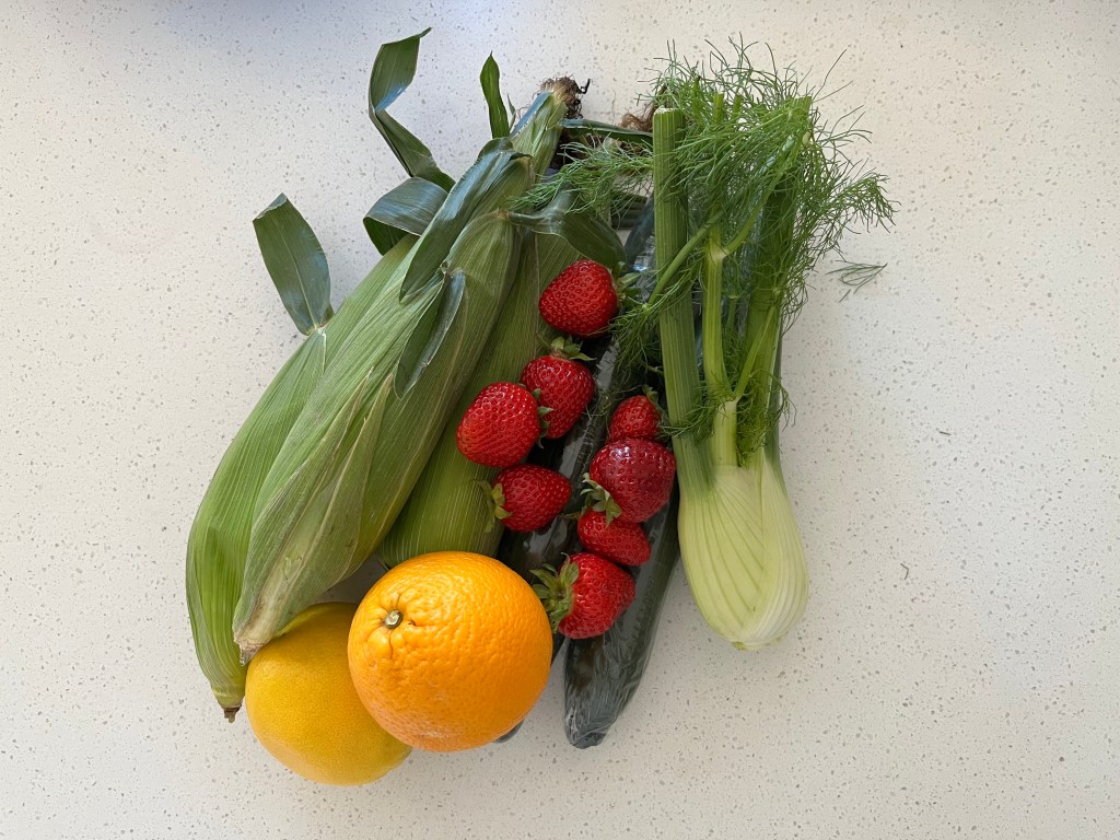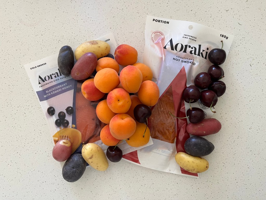The first sweet corn is appearing, and I also picked up strawberries, blueberries, oranges, cucumber and a fennel bulb to make the salad with watercress I tried a couple of weeks ago to add to the Christmas table. I picked up some apricots, two types of smoked salmon (the third we will collect on Monday) and these pretty colourful potatoes along with dill and some cherries.